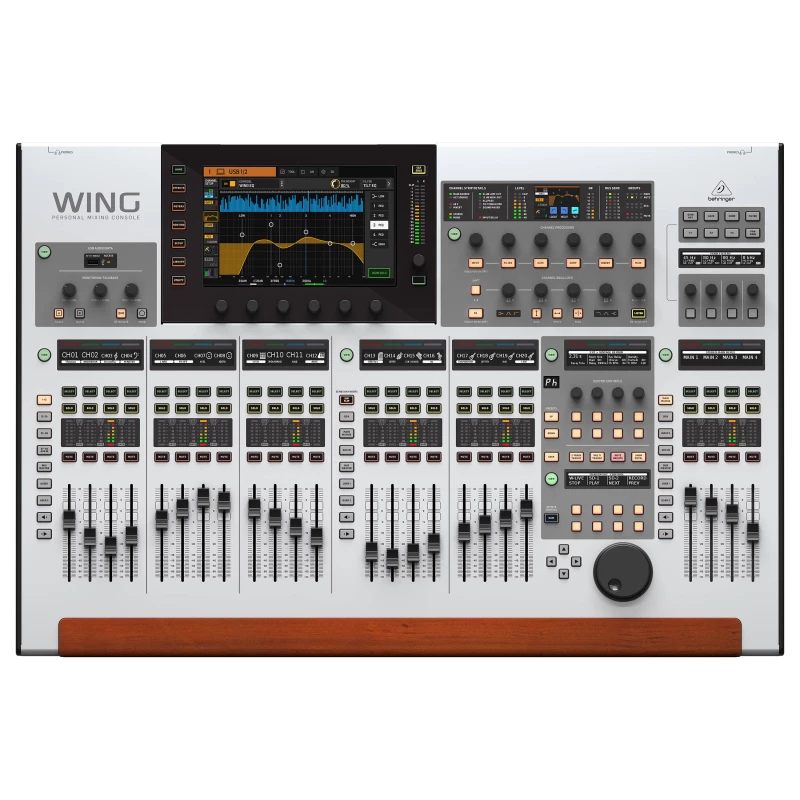 Для управления консолью и каналами предусмотрены 24 моторизованных фейдера (100 мм), большой сенсорный дисплей. Дополнительно на микшере установлены сенсорные элементы управления, выполняющие роли вращающихся регуляторов. На корпусе Behringer WING также располагается два порта для подключения SD-карт — консоль может работать как полевой рекордер с возможностью одновременной записи до 64 дорожек и расстановкой маркеров на треке.
