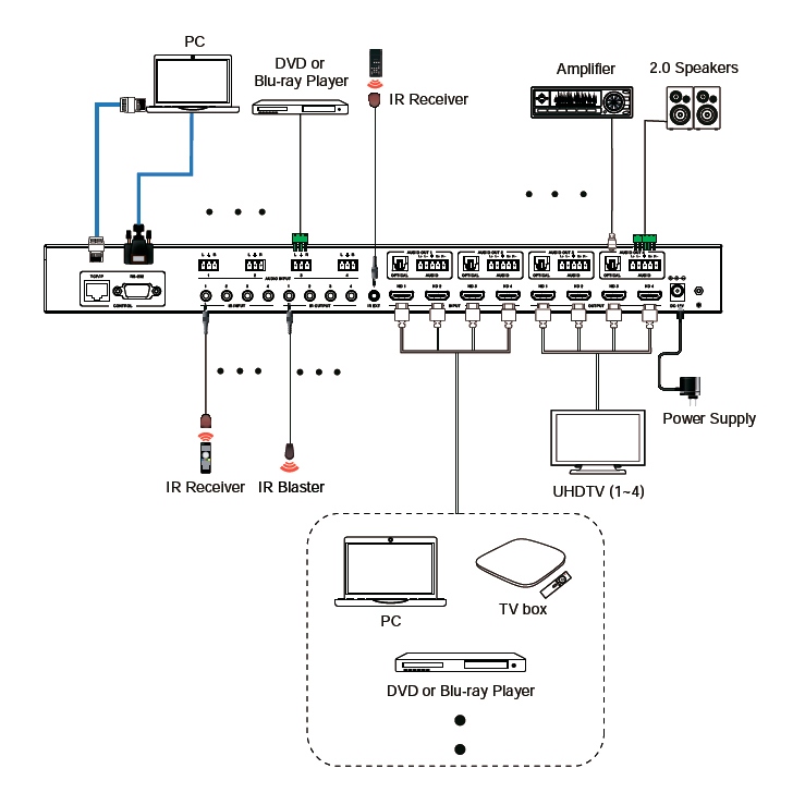 Данной матрицей можно управлять с помощью кнопок на передней панели, ИК-пульта дистанционного управления, интерфейса RS-232 и веб-интерфейса.