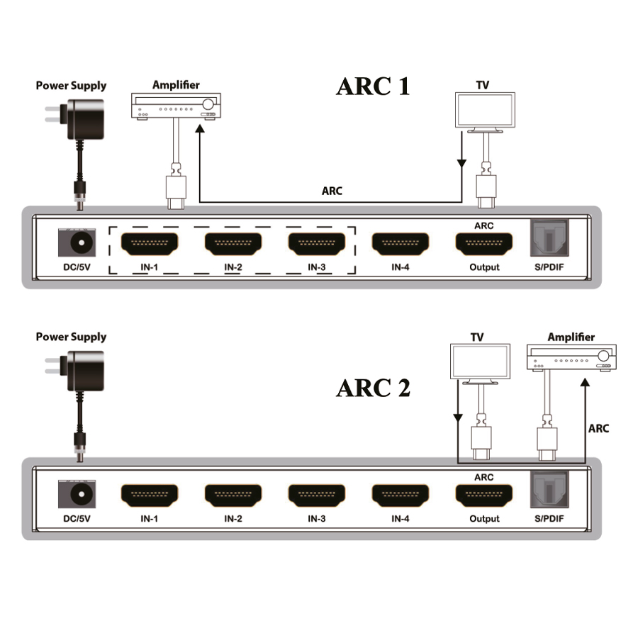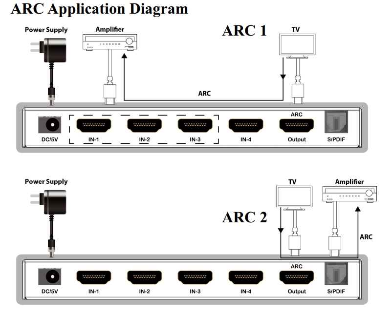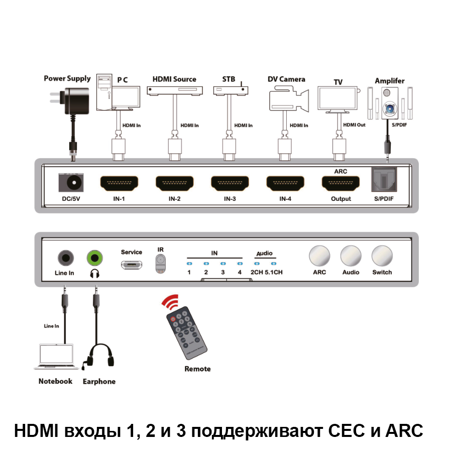 - Петлевой ARC (можно вывести звук с ТВ для подключения саундбара) HDMI In1,In2,In3