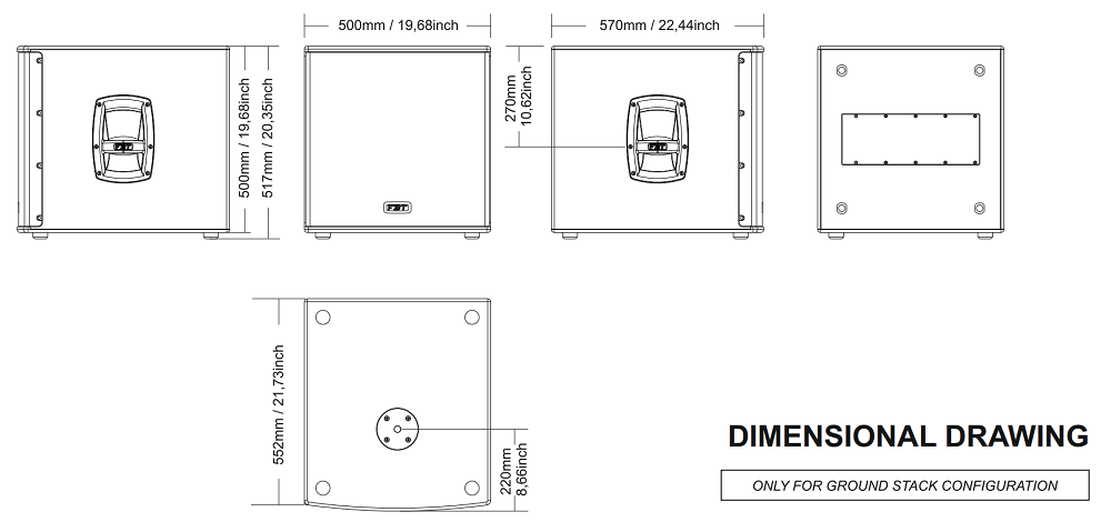Конструкция: Корпус выполнен из березовой фанеры толщиной 15 мм (0,59") и покрыт устойчивой к царапинам черной краской. Имеет две алюминиевые ручки для переноски. Верхняя панель оснащена адаптером для штатива M20, что позволяет устанавливать на сабвуфер сателлитные акустические системы, такие как колонки серии FBT и другие.