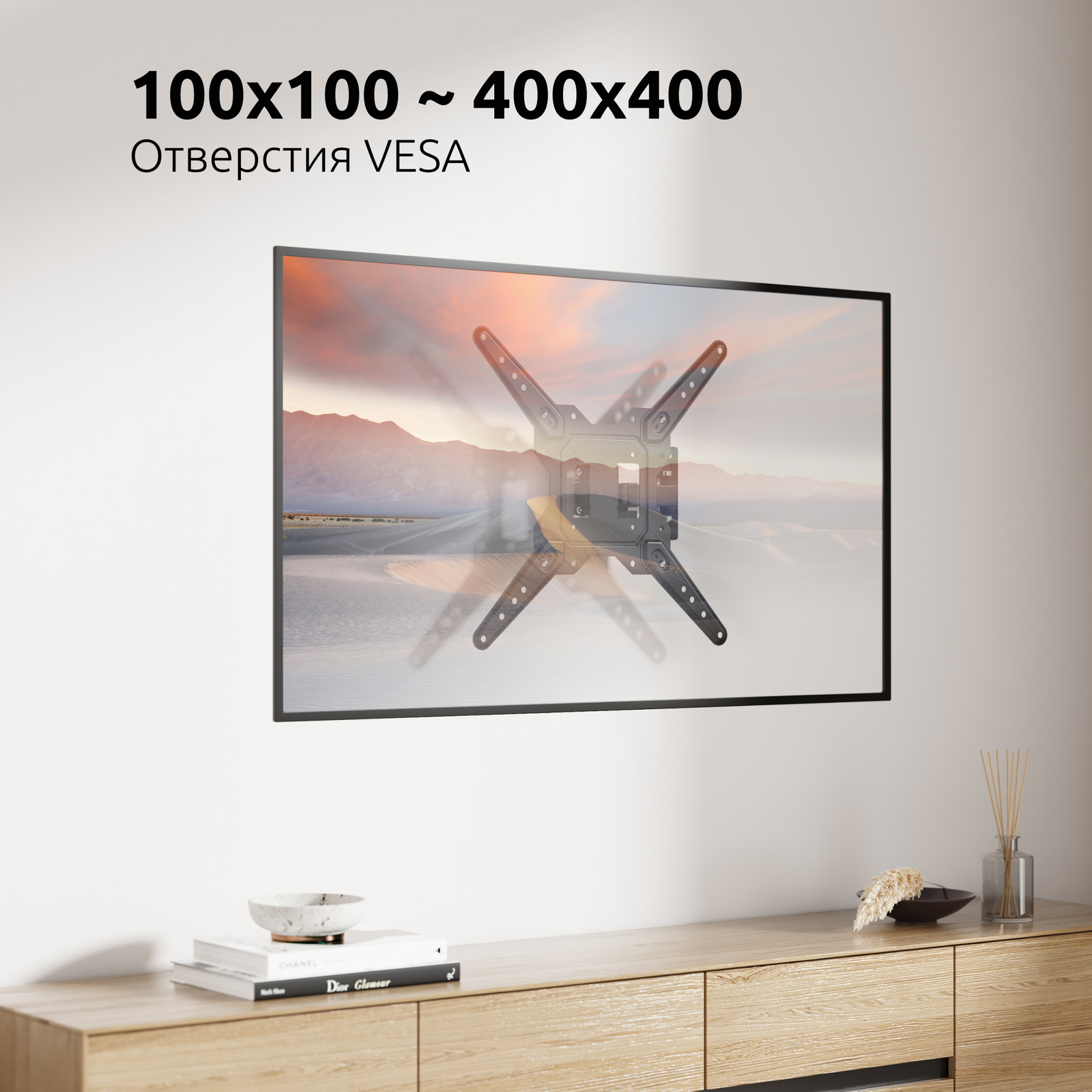Подходит практически всем современным телевизорам - LCD, LED, OLED, Ultra HD, plasma, с выгнутыми и плоскими мониторами. Поддерживает стандарты VESA в диапазоне от 50x100 мм. до 400x400 мм.