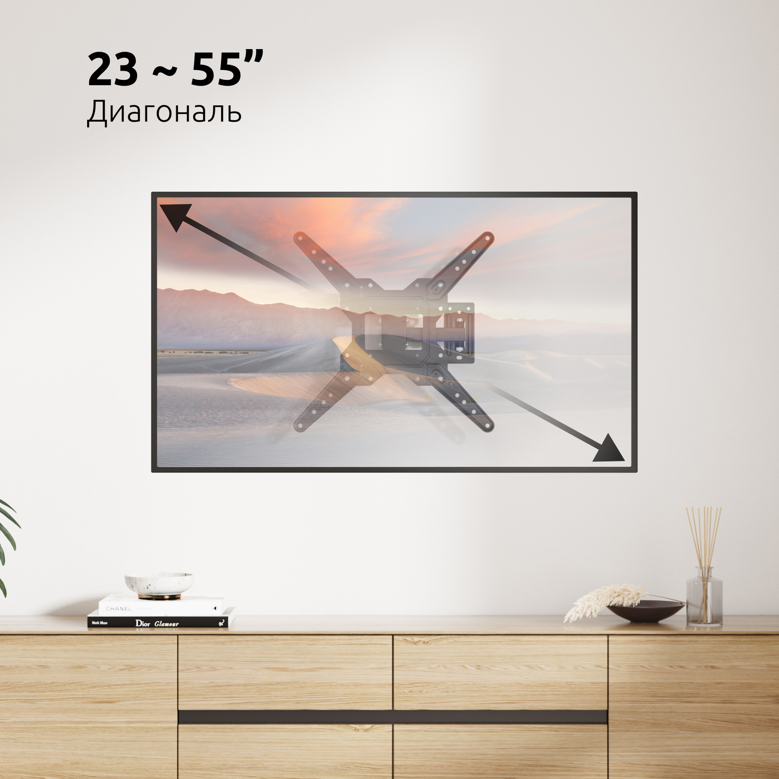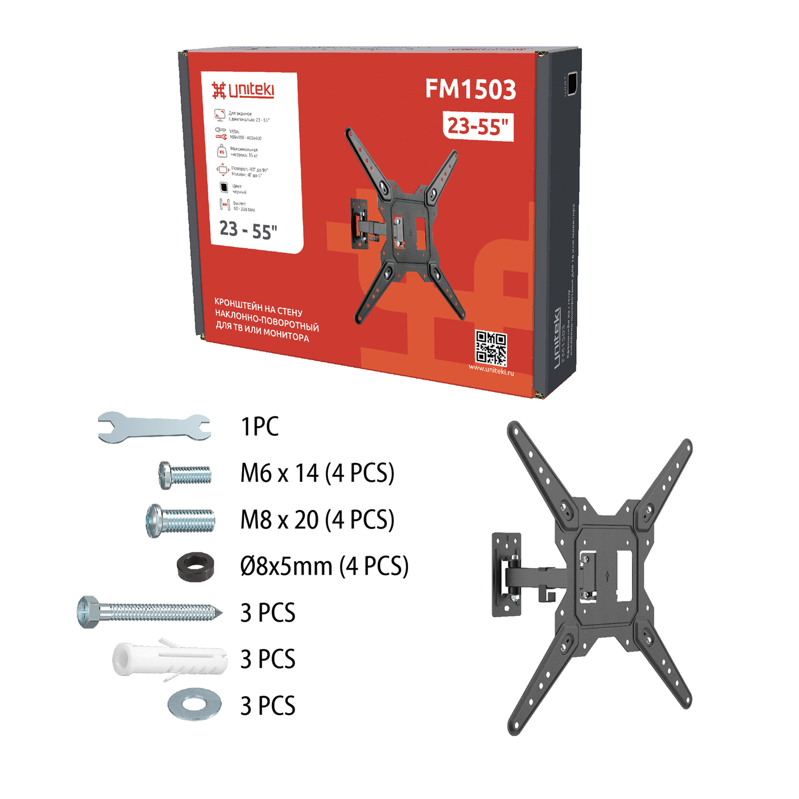 Настенный наклонно-поворотный кронштейн UNITEKI FM1503 предназначен для ТВ с диагональю от 23 до 55 дюймов (58-132 см).