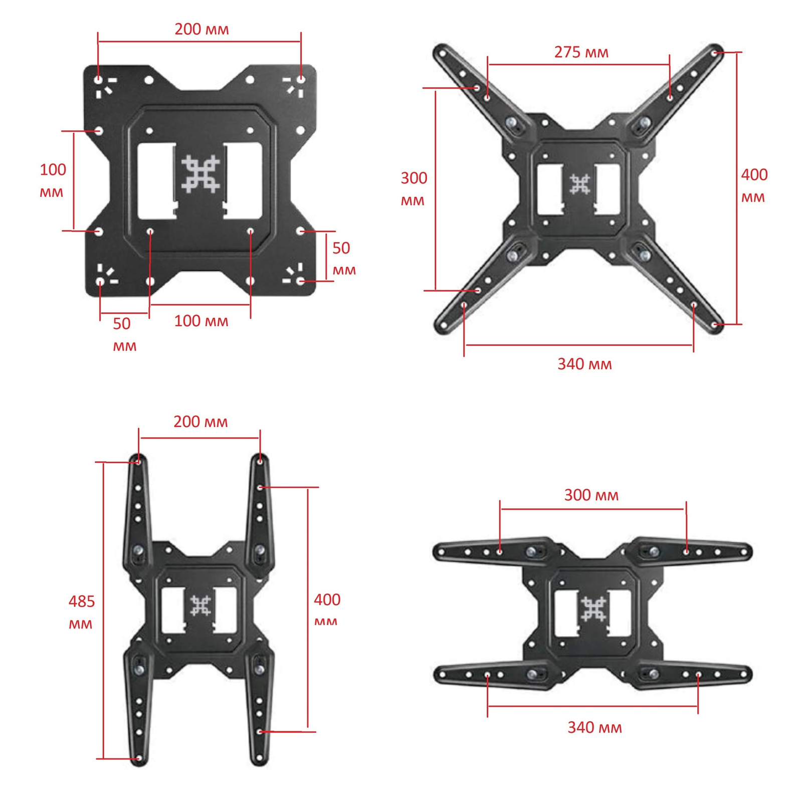 - Нестандартные крепежные отверстия VESA, (мм.): 50x100, 500x200, 275x275, 340x340, 200x340, 200x485, 340x200, 485x200