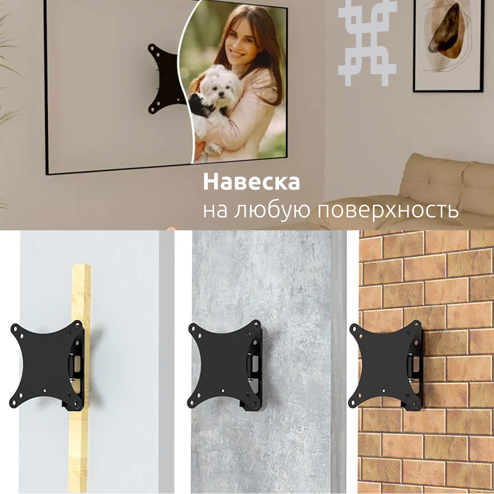 Кронштейн подходит для большинства телевизоров и мониторов популярных брендов, среди которых Samsung, LG, Sony, KIVI, Tcl, Xiaomi Mi, SUPRA, Panasonic, Hyundai, Erisson, Asano, Horizont, JVC, Thomson, Sharp, Toshiba, Skyworth, BBK, AVEL, Витязь, Веко, BQ, DEXP, SkyLine, Pioneer, Rolsen, Harper, Hisense, Hitachi, Polarline, Prestigio, Telefunken и др.
