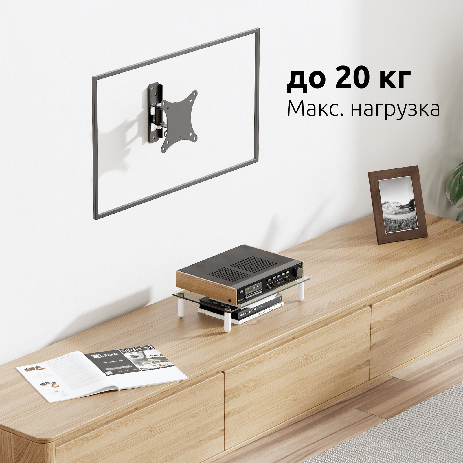 Максимальный выдерживаемый вес составляет 20 кг., что делает кронштейн подходящим для широкой линейки малых и средних digital-панелей.