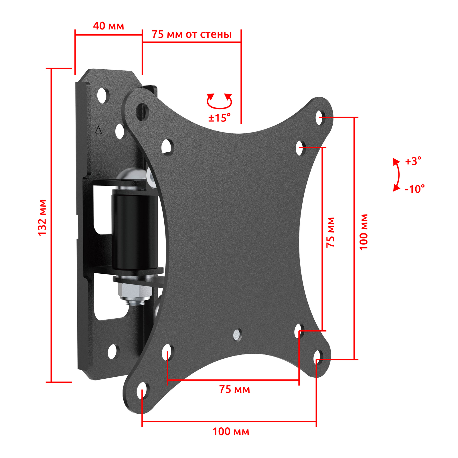 Расстояние от стены составляет 75 мм., что придает кронштейну компактный и аккуратный внешний вид, делая его почти незаметным за Вашей ТВ-панелью.