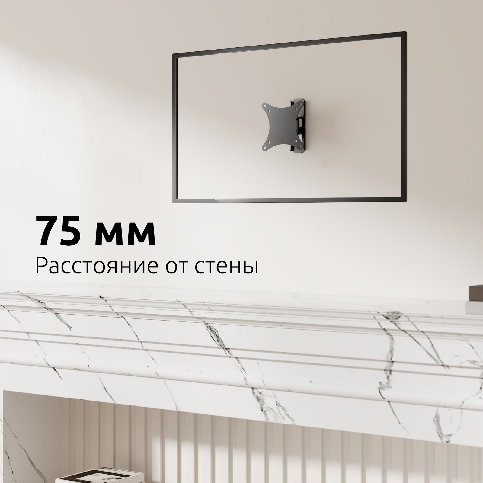 Расстояние от стены составляет 75 мм., что придает кронштейну компактный и аккуратный внешний вид, делая его почти незаметным за Вашей ТВ-панелью.