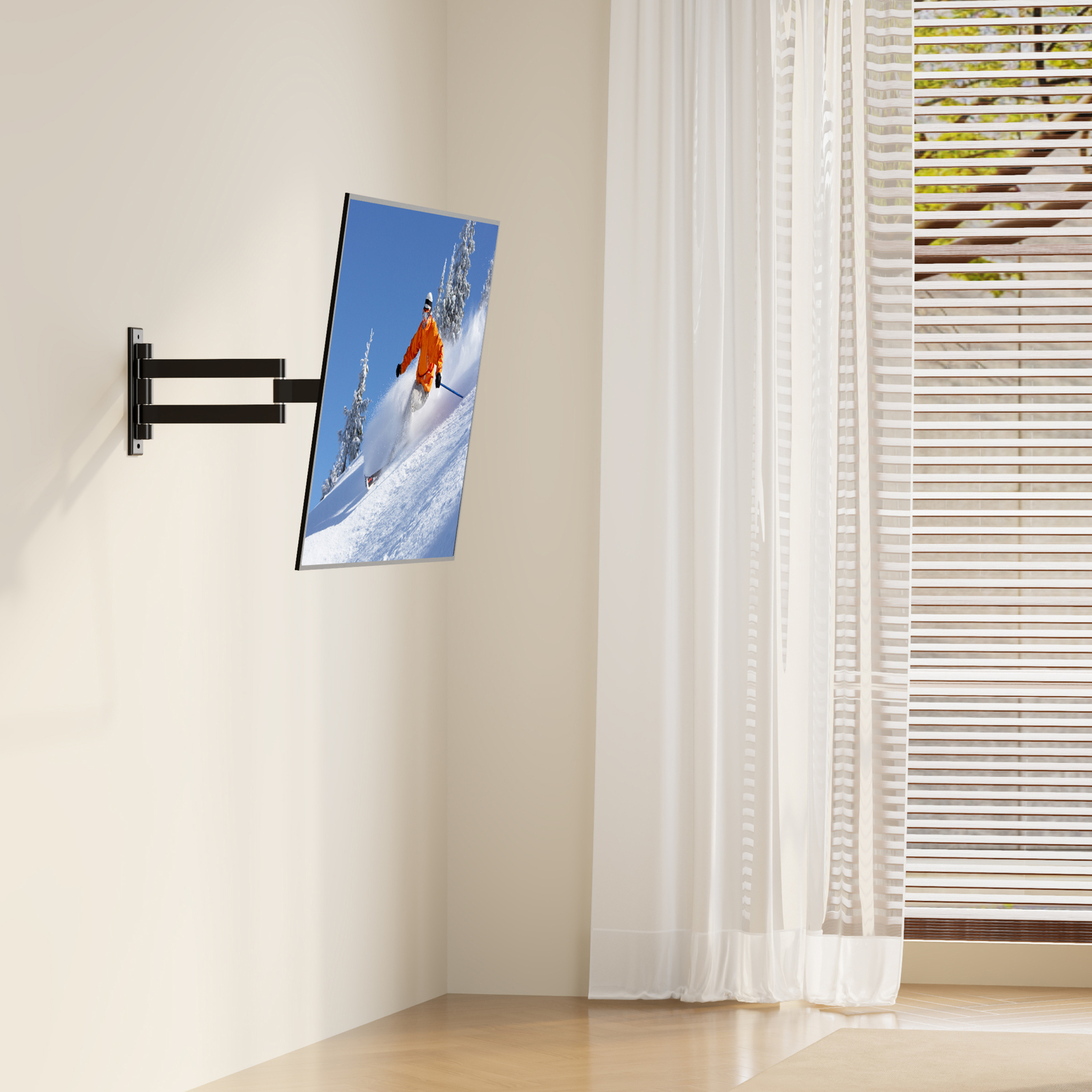 Для поворота телевизора Вам не нужно использовать дополнительных приспособлений или прилагать усилия. Вы сможете повернуть панель и изменить расстояние от стены лёгким движением руки.