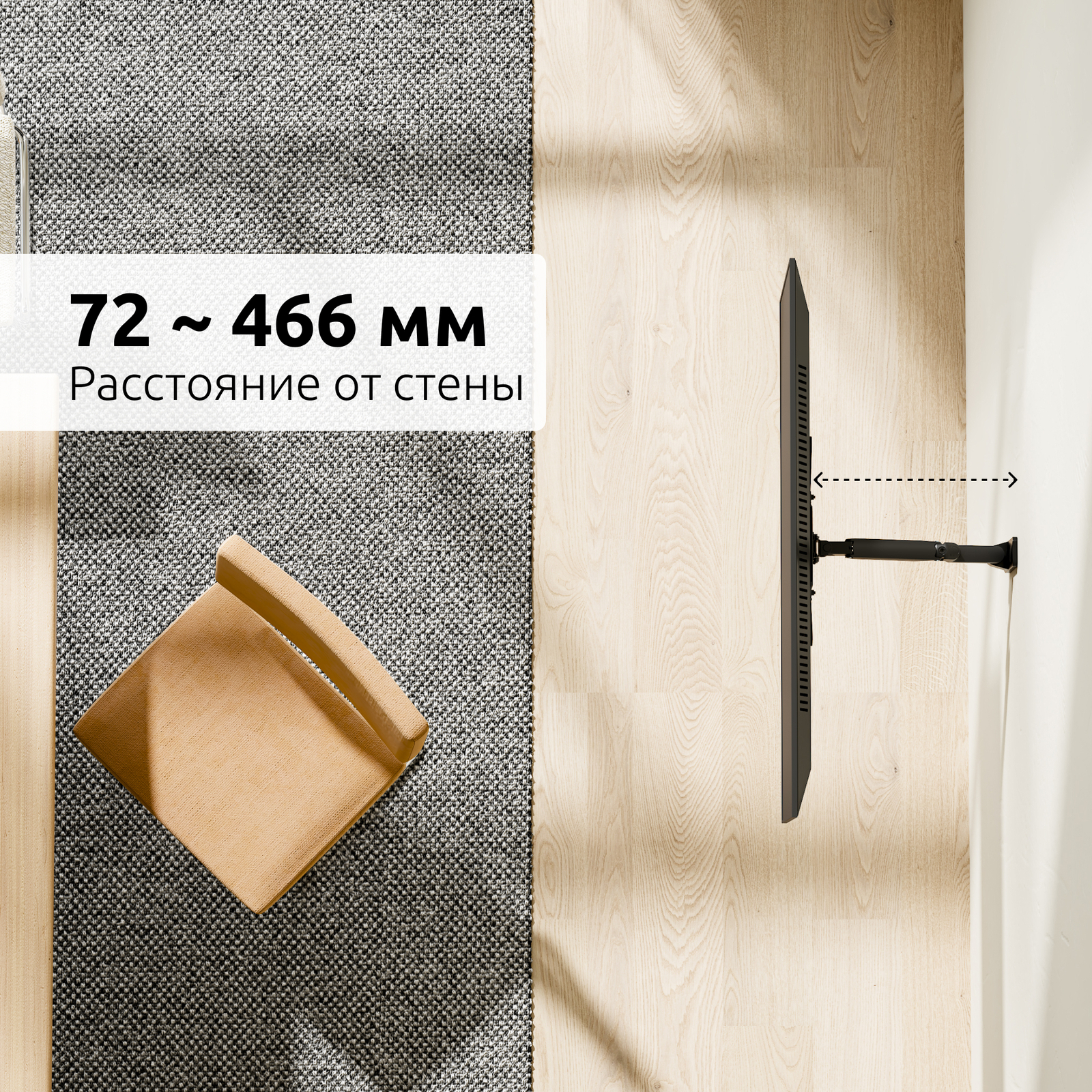 Вы сможете повернуть телевизор или монитор и изменить расстояние от стены лёгким движением руки, при этом телевизор зафиксируется в настроенном положении.