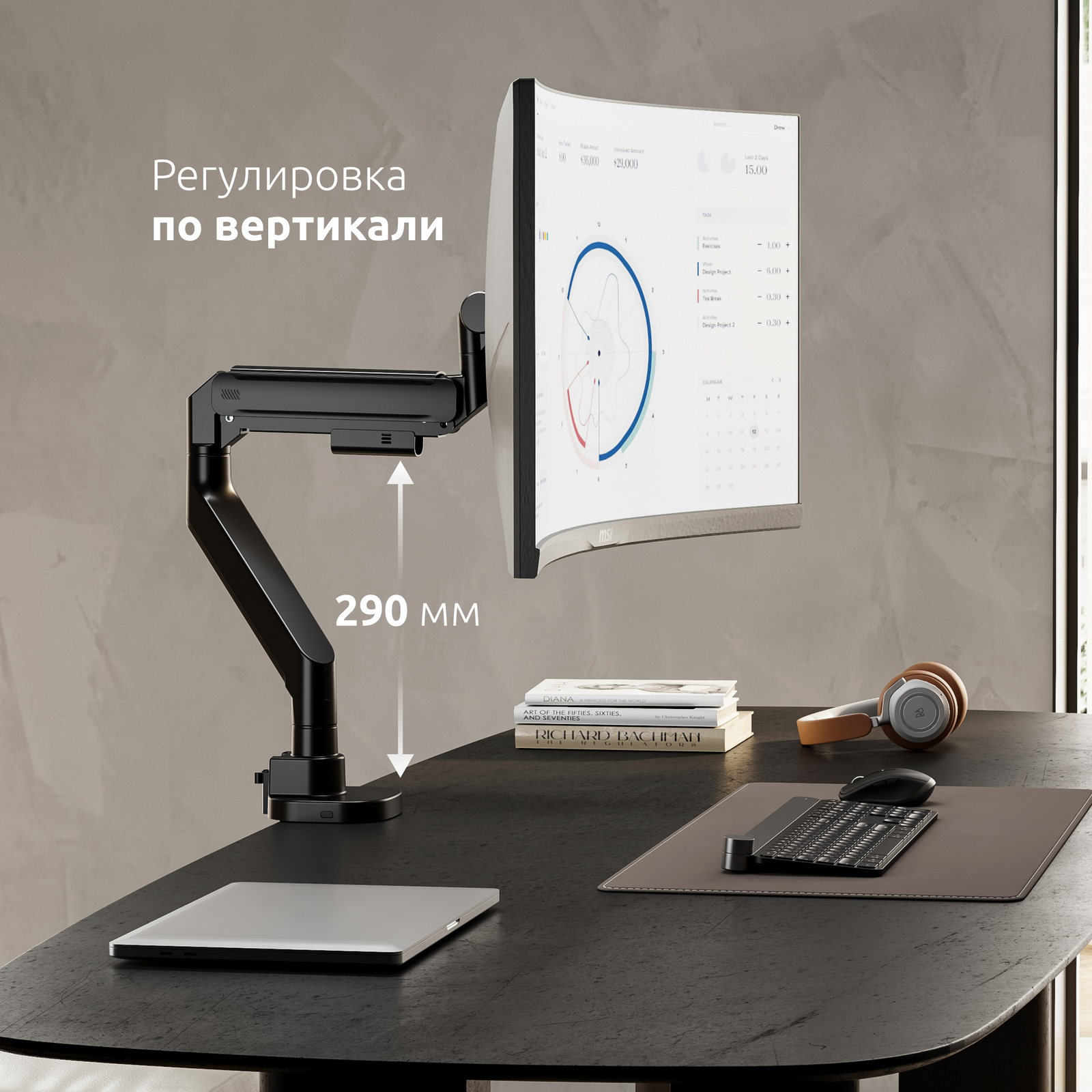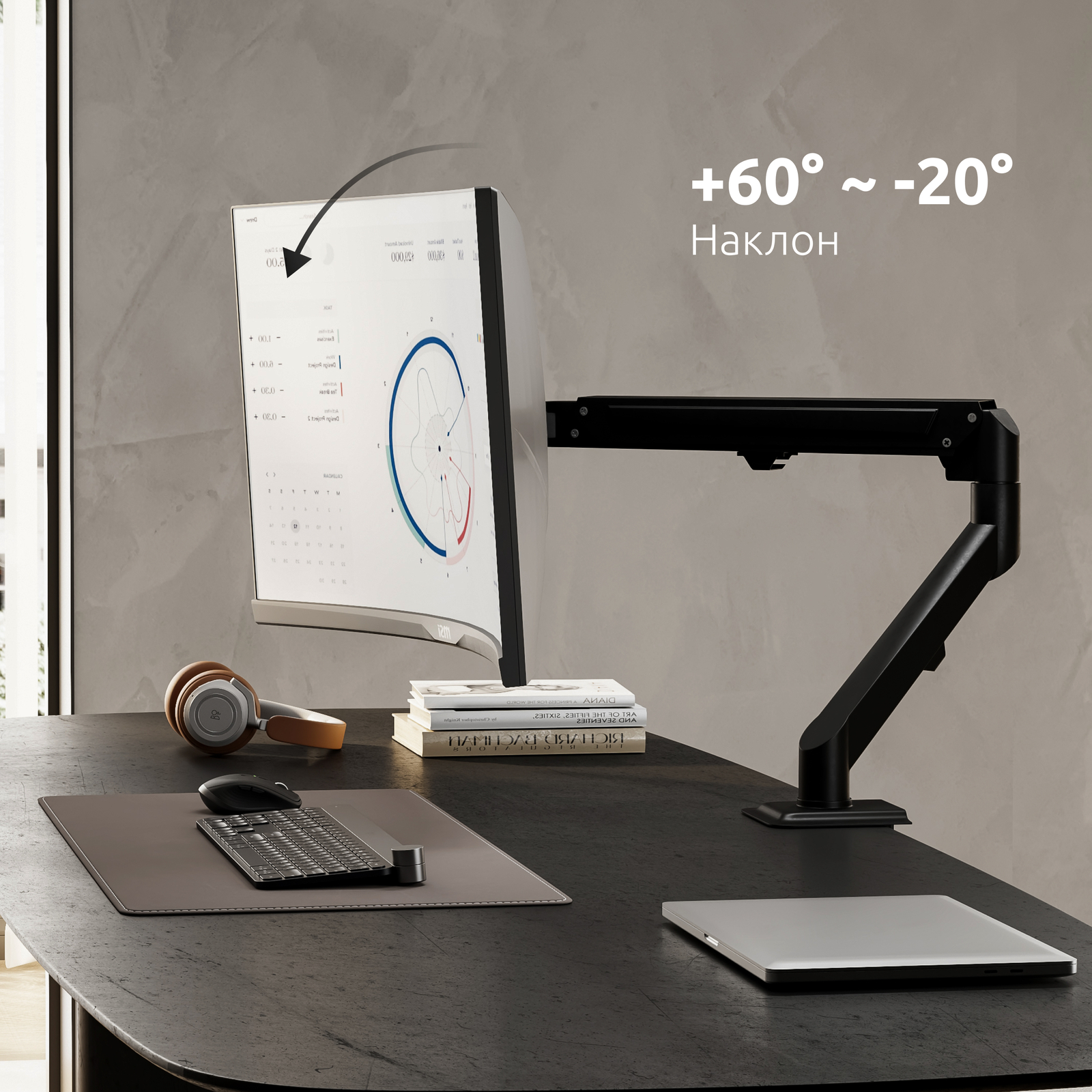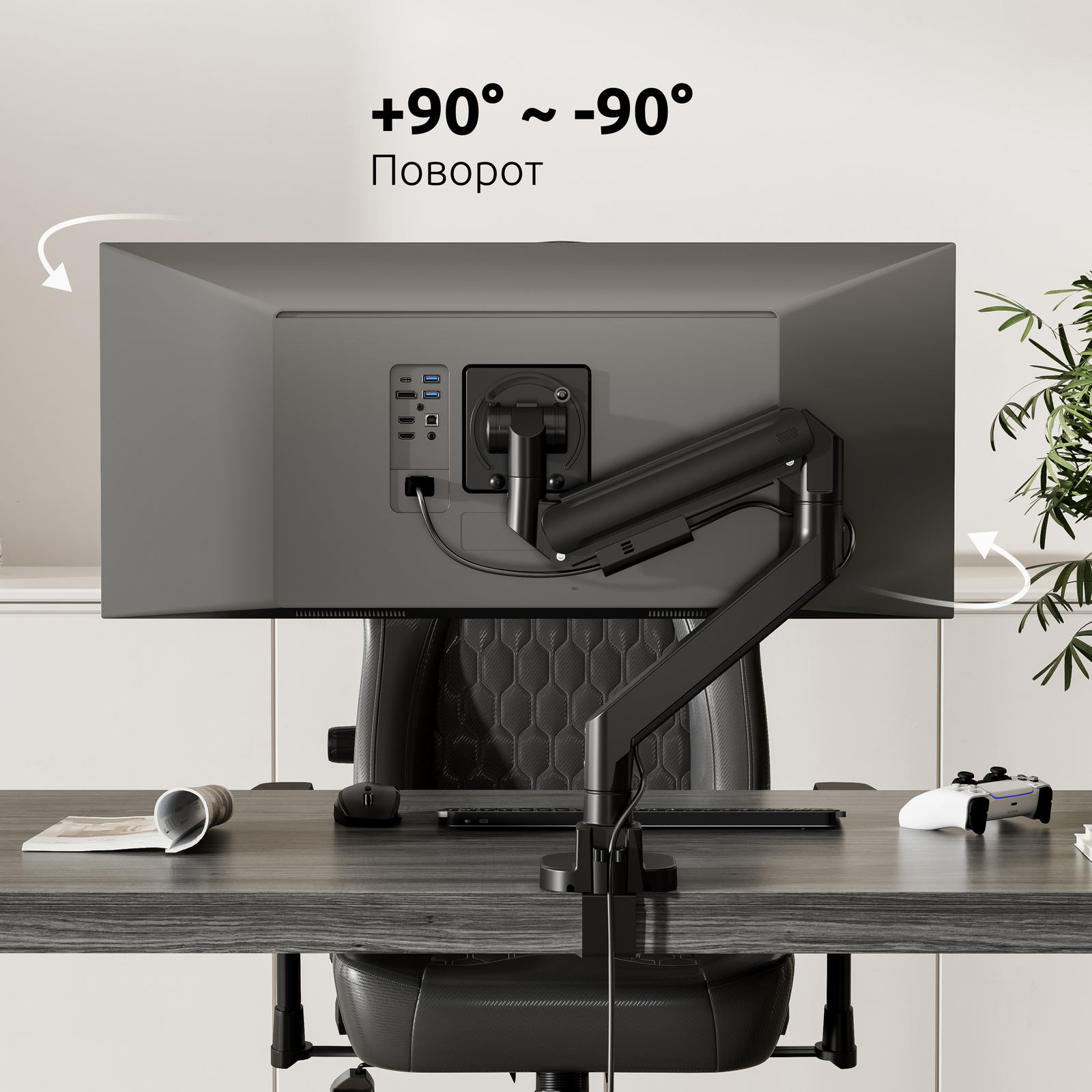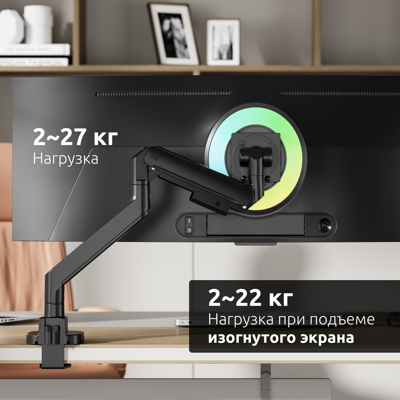 Механизм с газовой пружиной внутри корпуса кронштейна дает возможность легко и плавно перемещать монитор в любую нужную вам позицию, следуя за положением вашего тела во время работы за компьютером, максимально снижая нагрузку на зрение и позвоночник.
