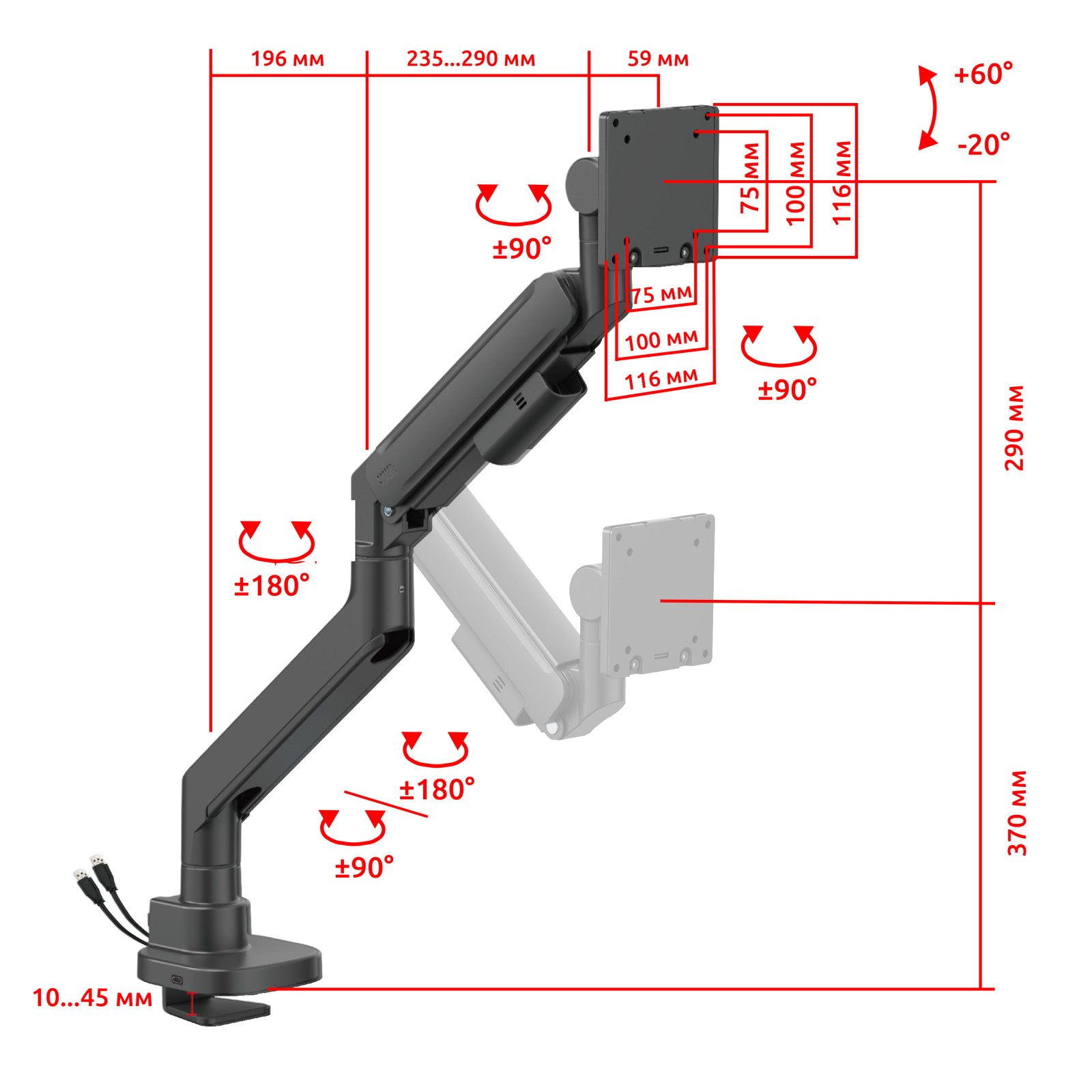 - Угол наклона, (град.): +60° ~ -20°