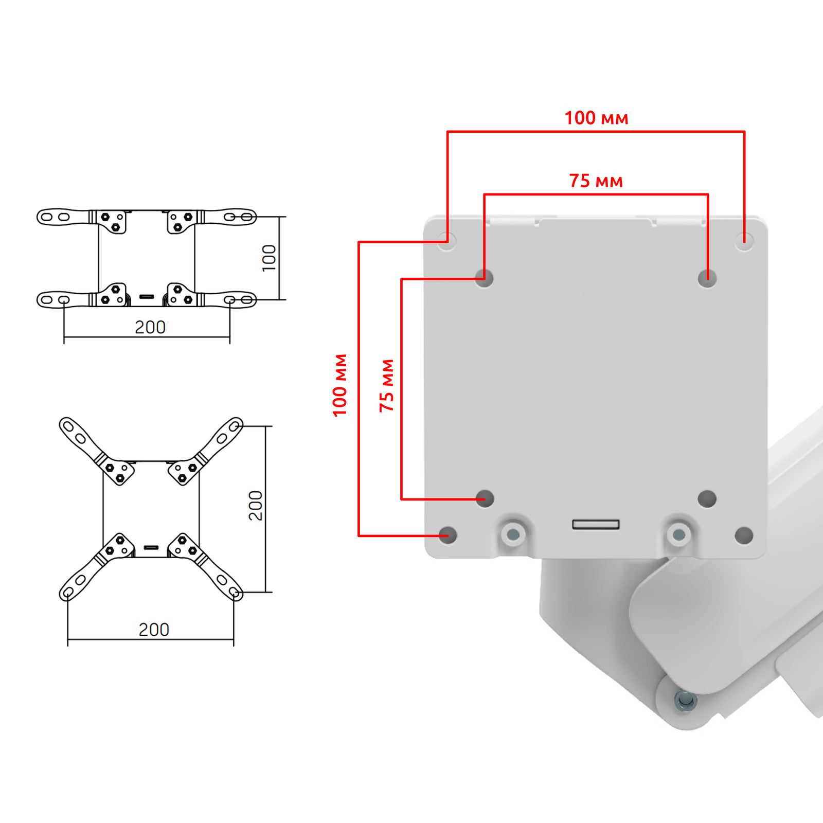- Крепежные отверстия VESA, (мм.): 75x75, 100х100, 100x200, 200x100, 200х200