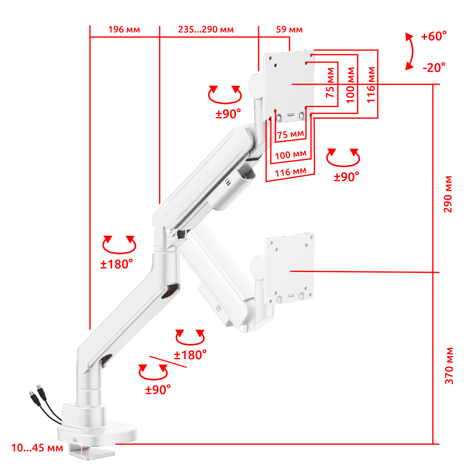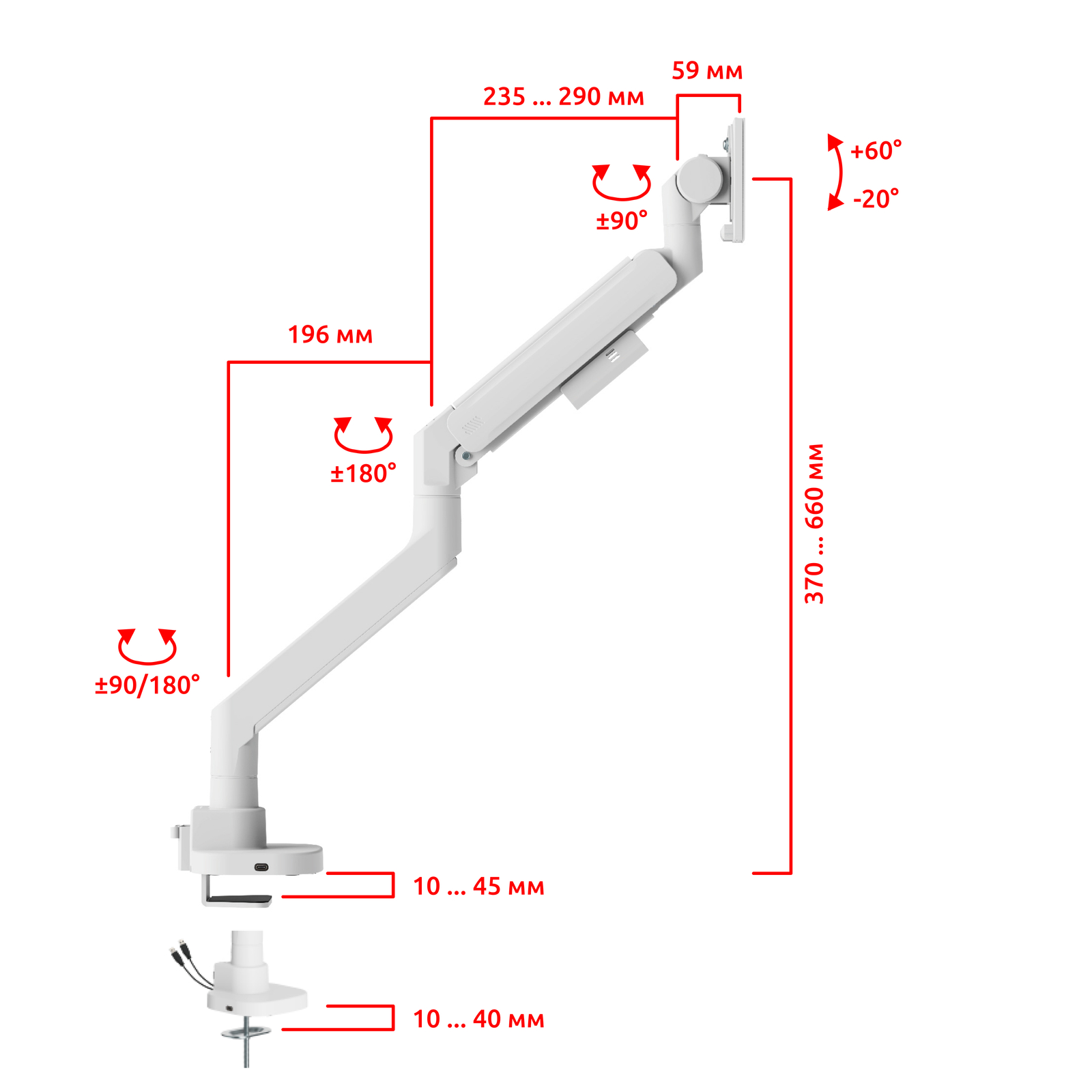 - Угол наклона, (град.): +60° ~ -20°