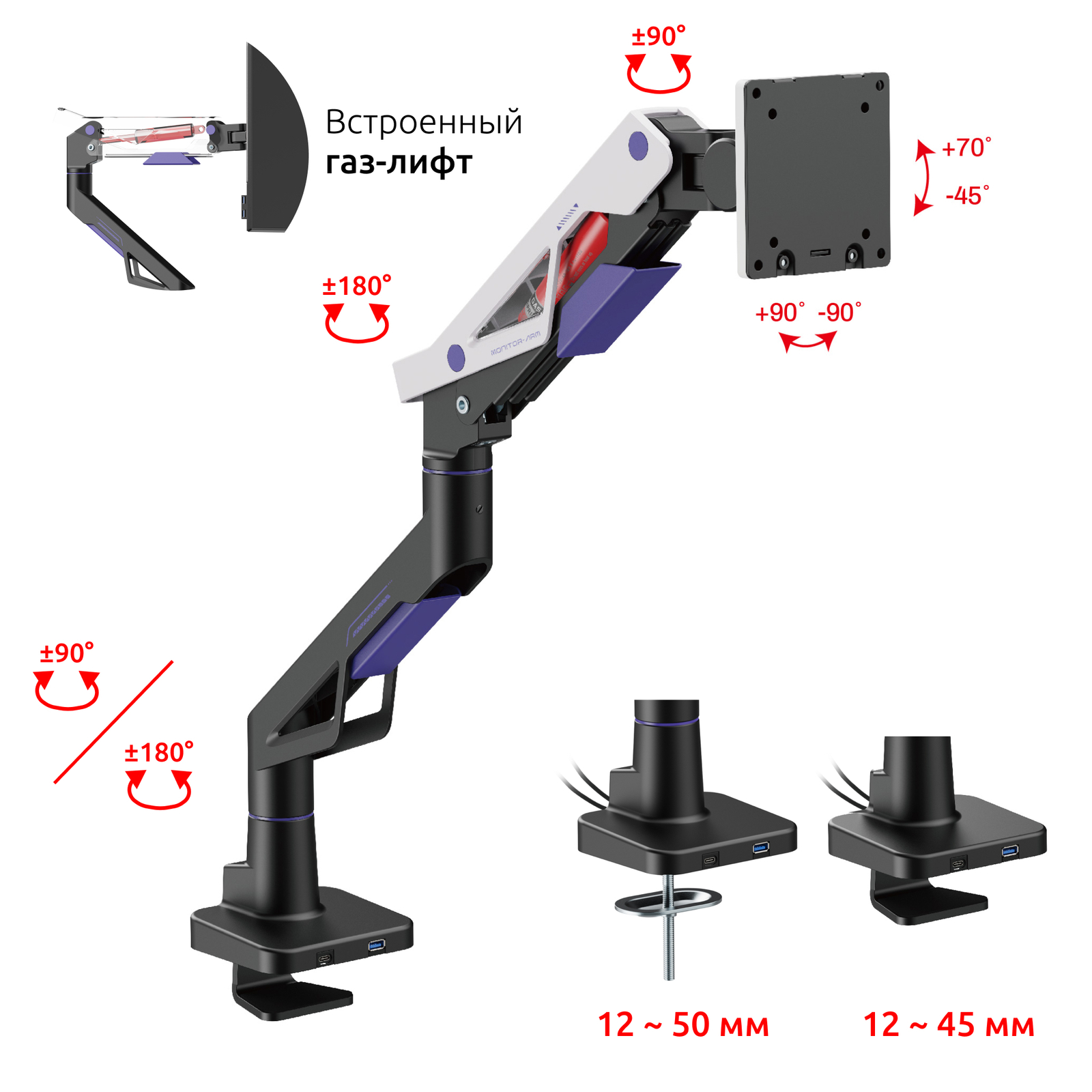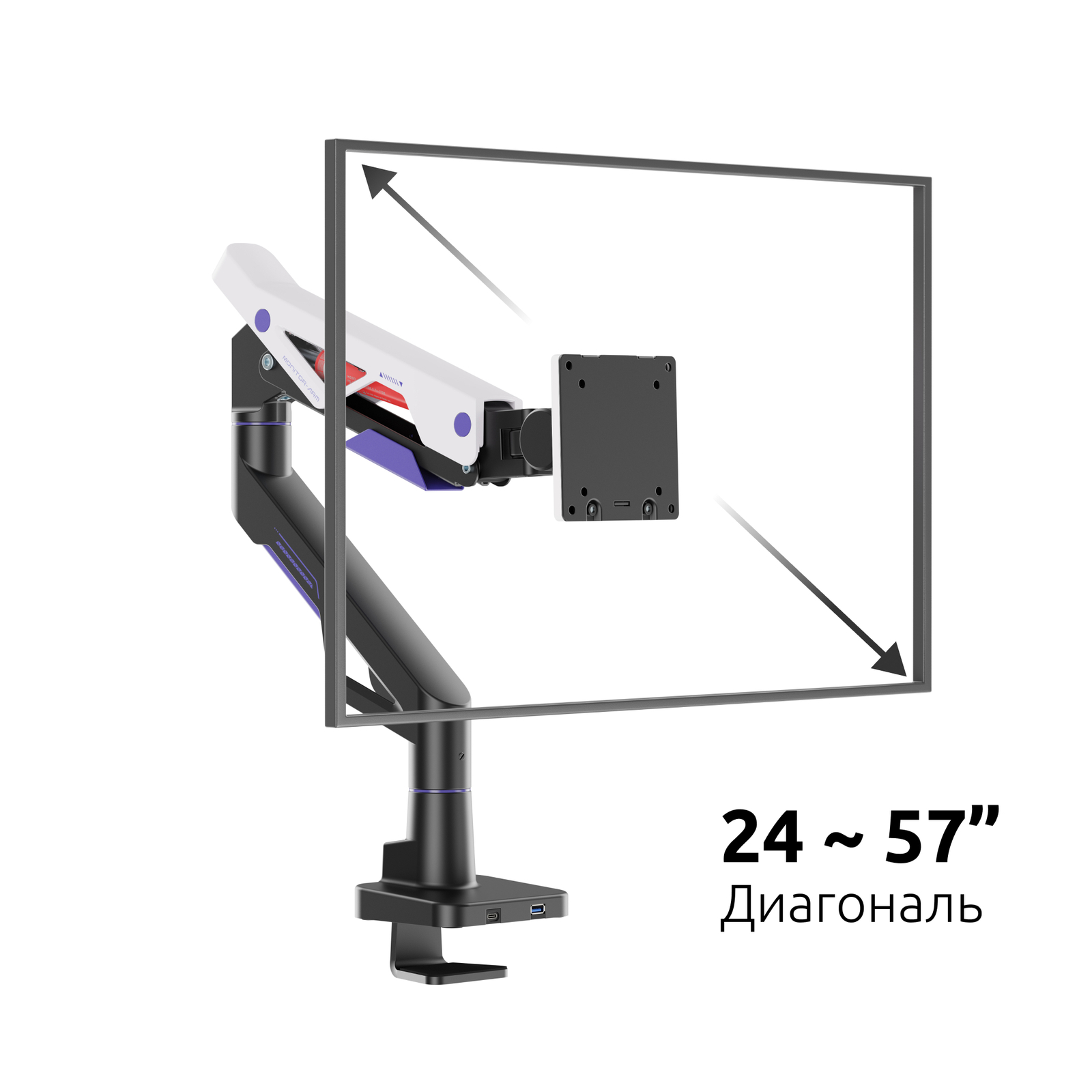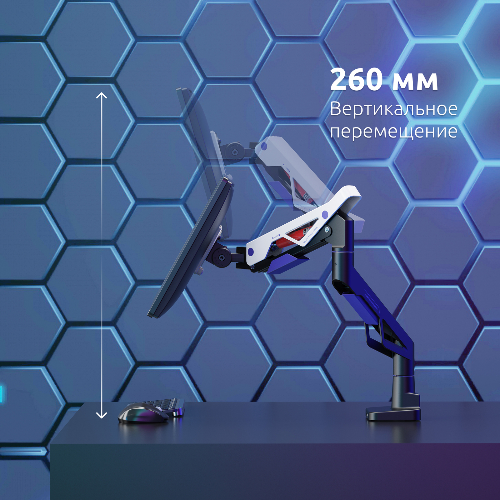 ATLAS NEO GAMING LINE кронштейн для монитора со струбциной, системы газлифт, диагональ 24-57", крепление с функцией перемещения в вертикальной плоскости и нагрузкой от 2 до 30 кг.