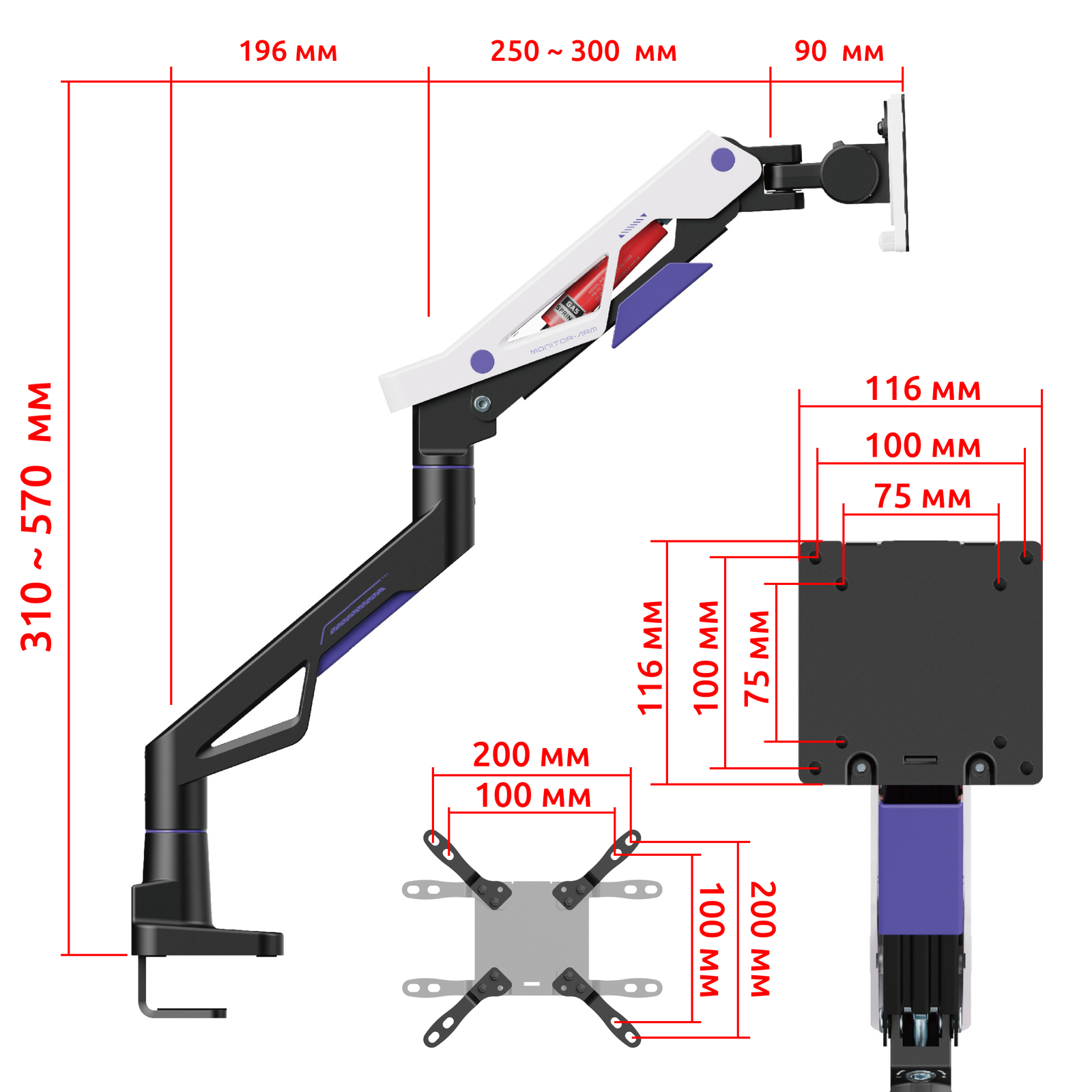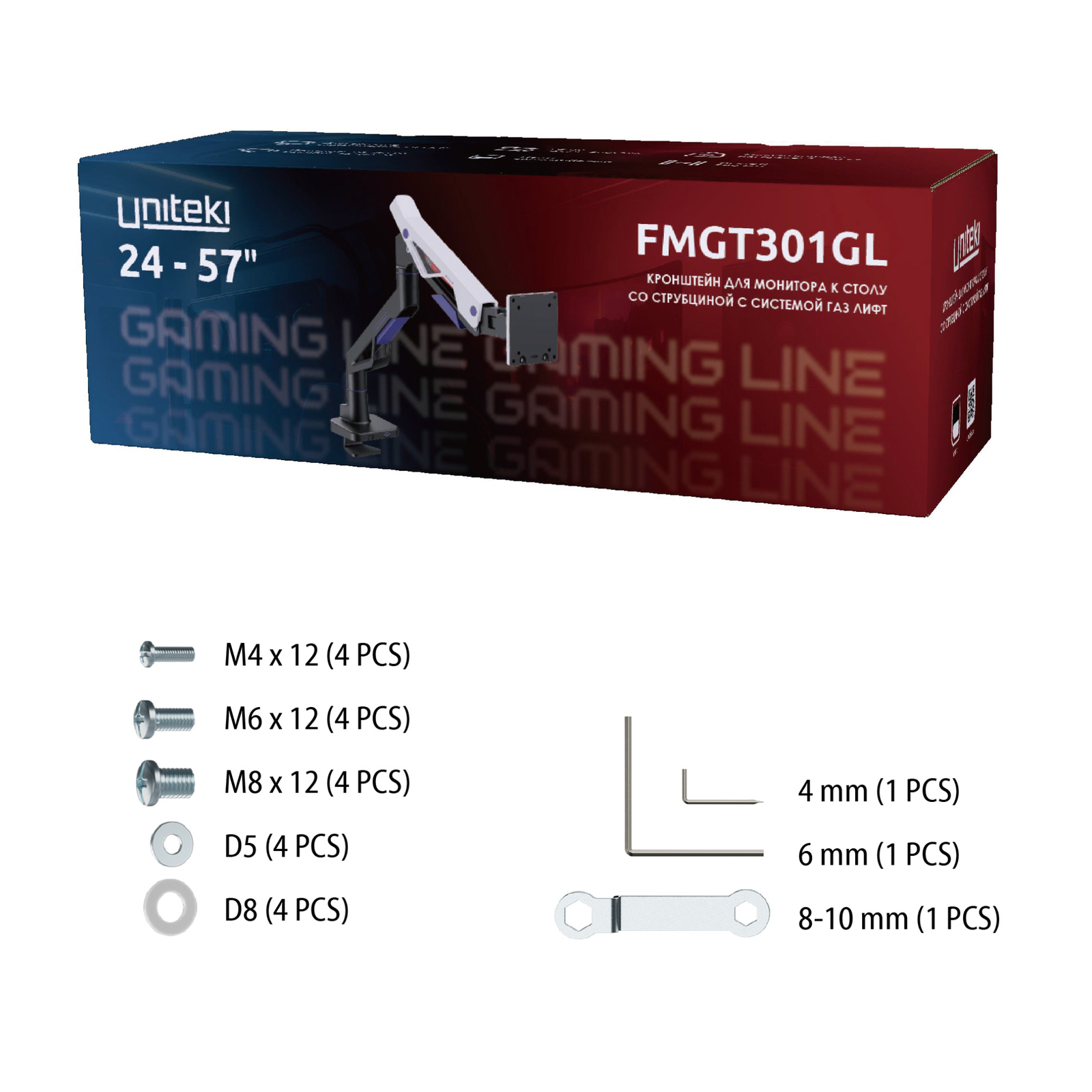 FMGT301GL – кронштейн из усовершенствованной линейки продуктов UNITEKI с невероятным, геймерским дизайном, усиленными ребрами жесткости крепежной пластины, фирменными бело-фиолетовыми полимерными накладками и оригинальным поршнем красного цвета.