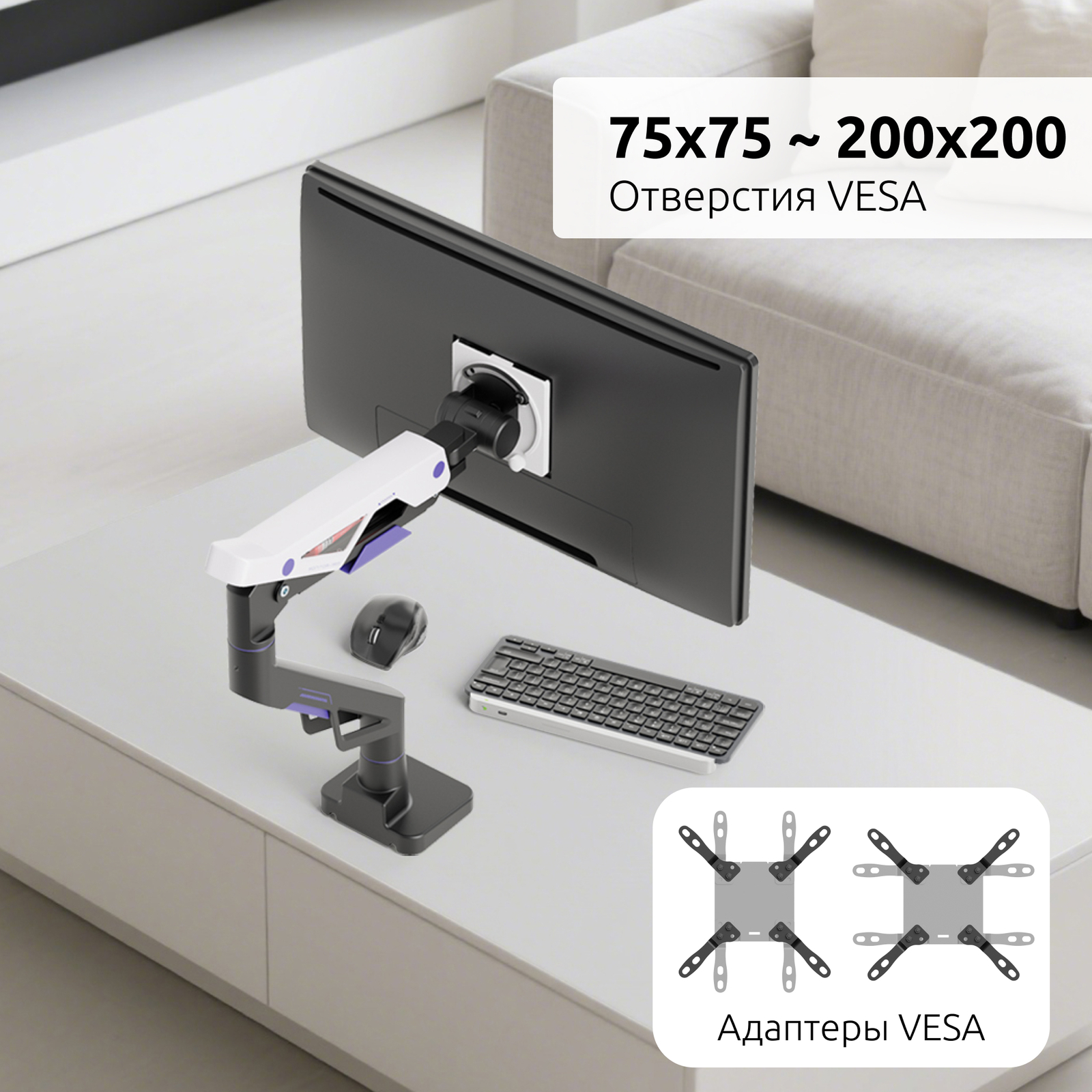 Он подходит для большинства компьютерных мониторов весом от 2 до 30 кг. с диагональю от 24 до 57 дюймов, под самые распространенные крепления стандарта VESA 75х75, 100х100, 100х200, 200х100, 200х200 мм.