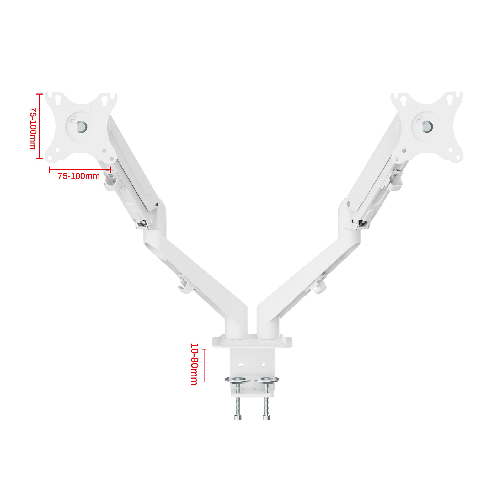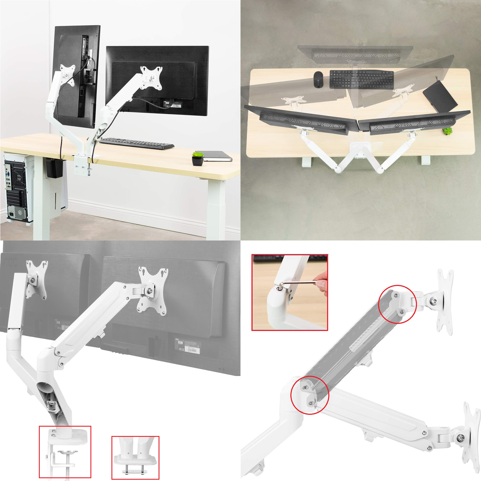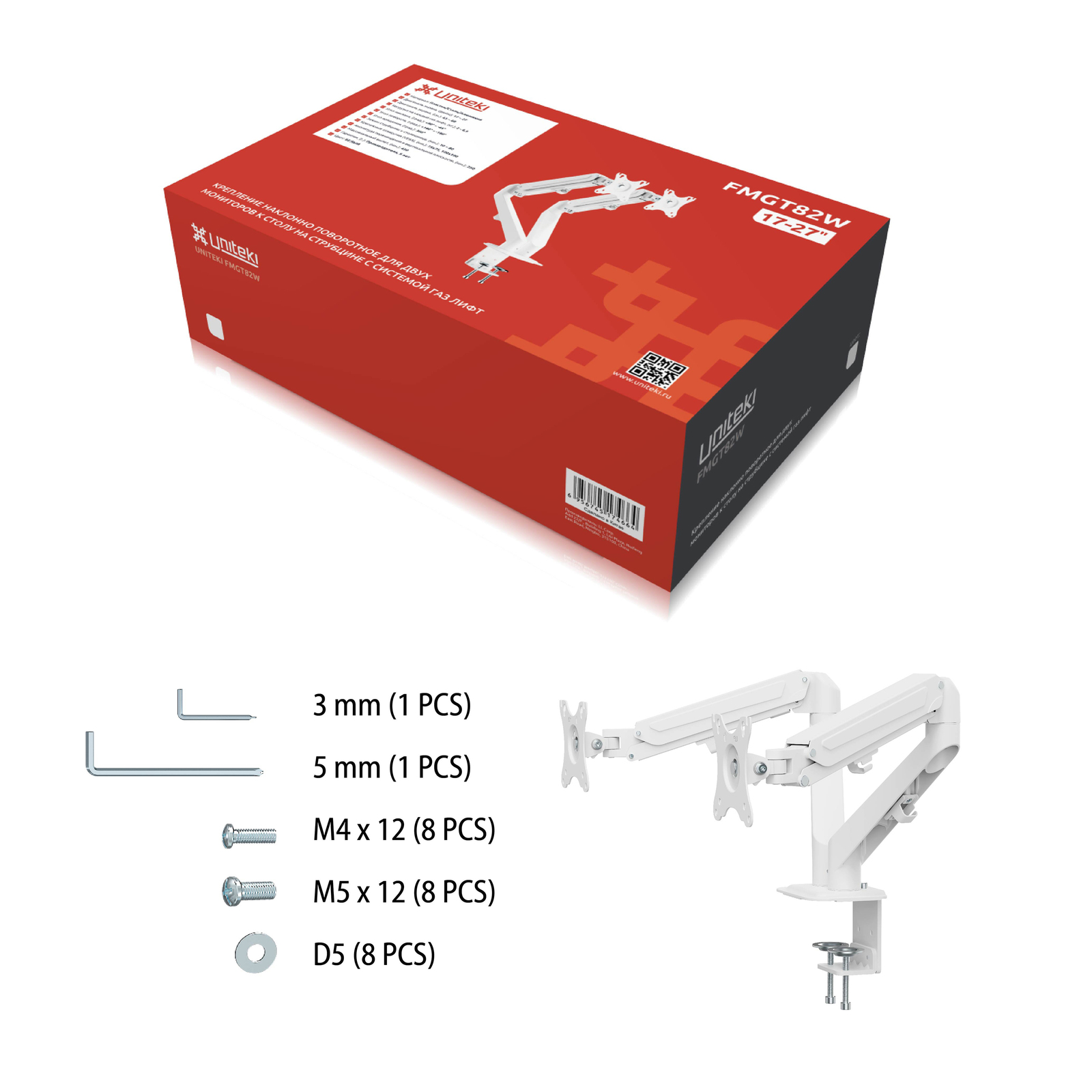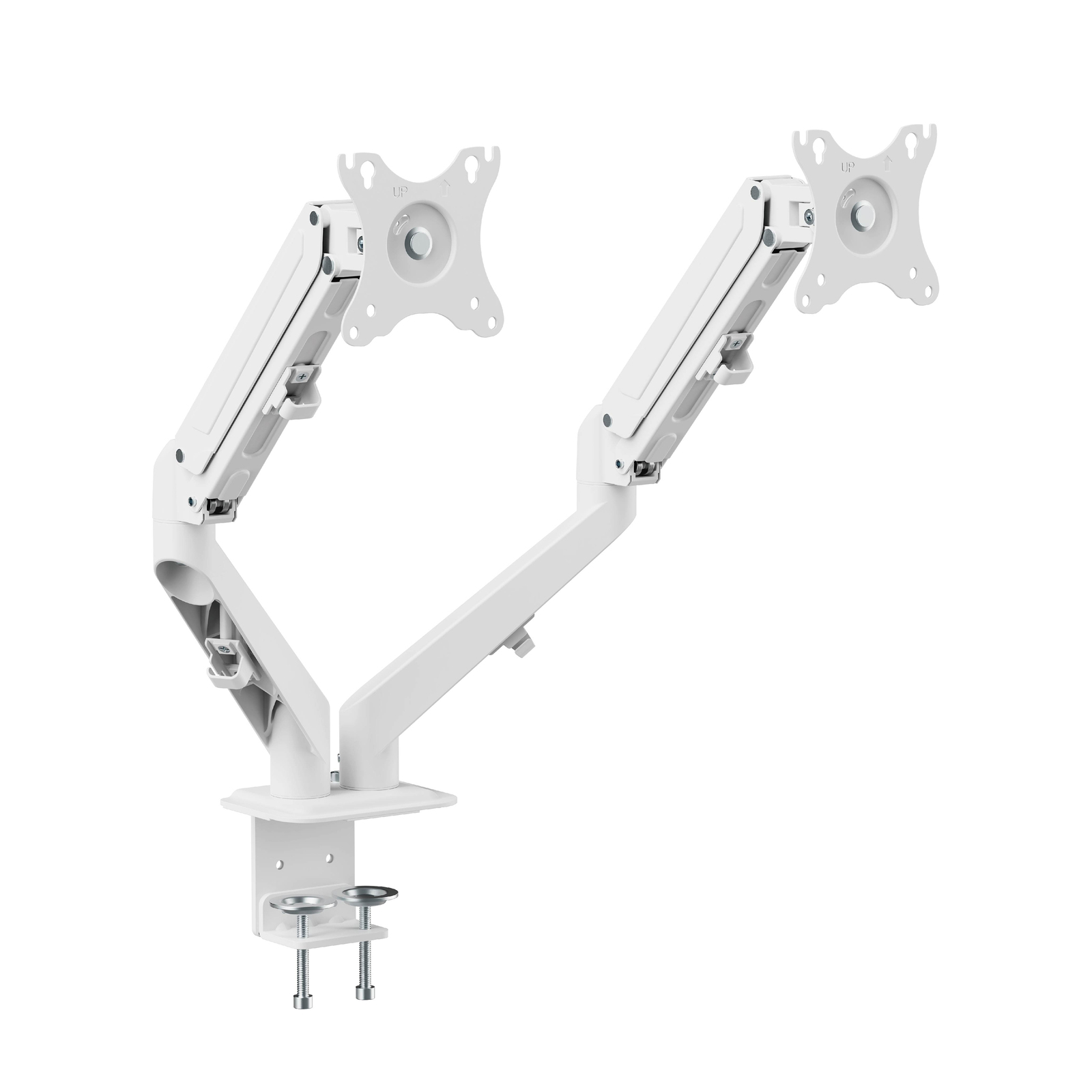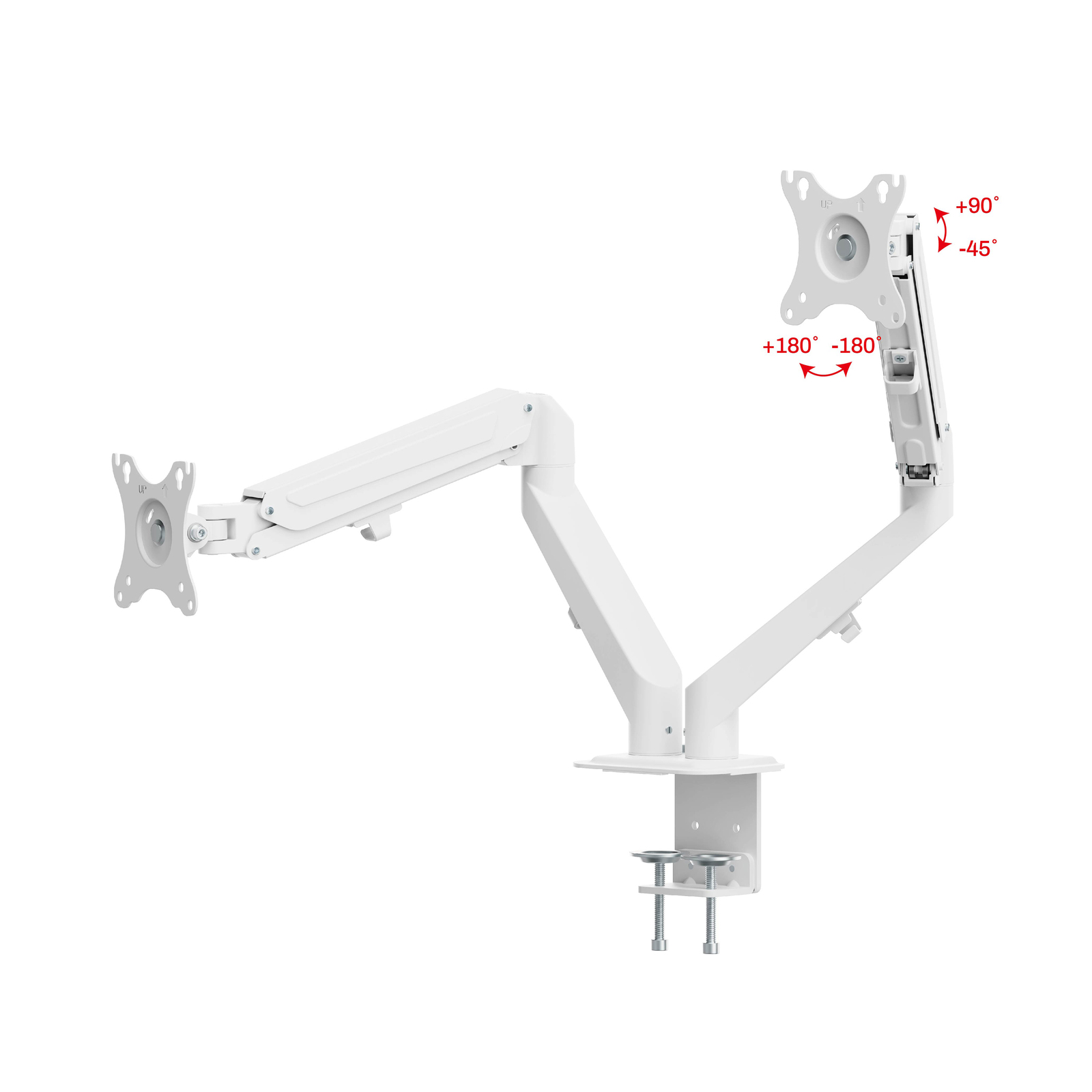 Настольный наклонно-поворотный кронштейн-крепление для двух мониторов с расположением в горизонтальной плоскости, системы газлифт, UNITEKI FMGT82W подходит для мониторов диагональю от 17 до 27 дюймов и весом от 2 до 6.5 кг на каждый.
