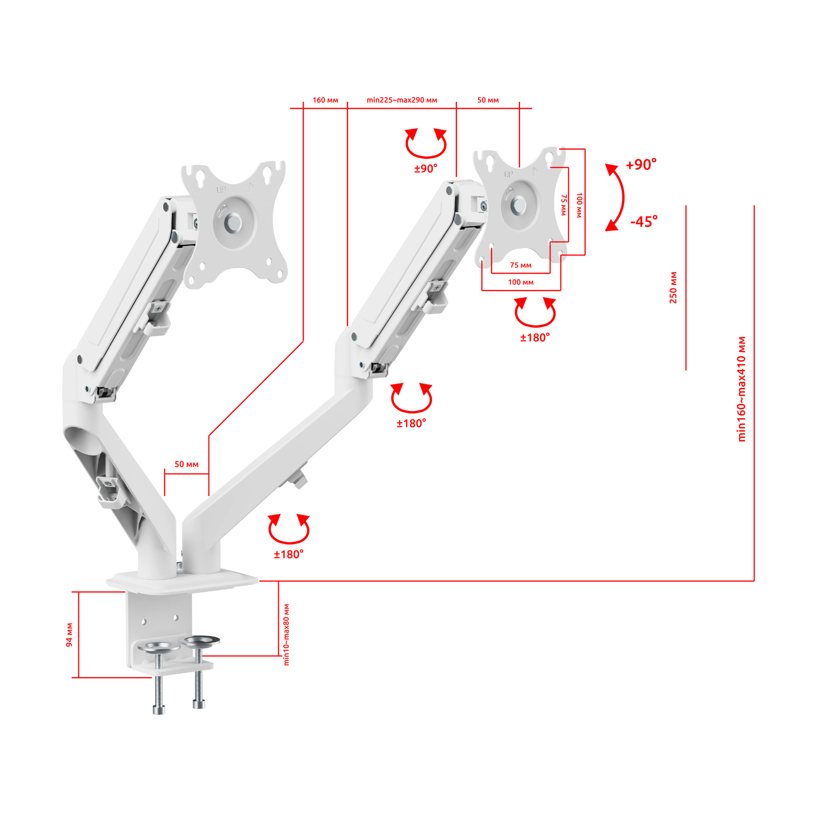- Тип кронштейна: Настольный со струбциной и системой газлифт для двух мониторов расположенных горизонтально