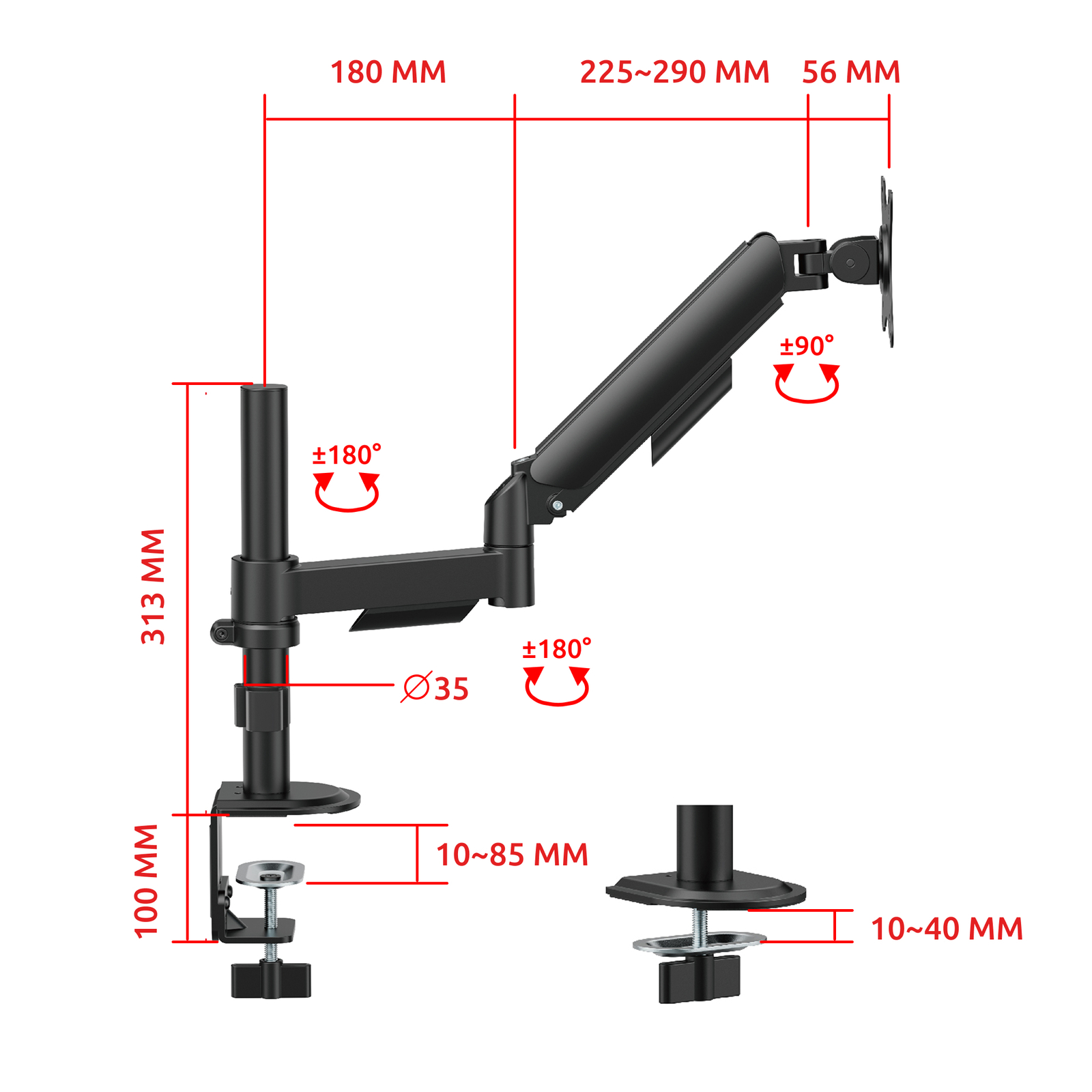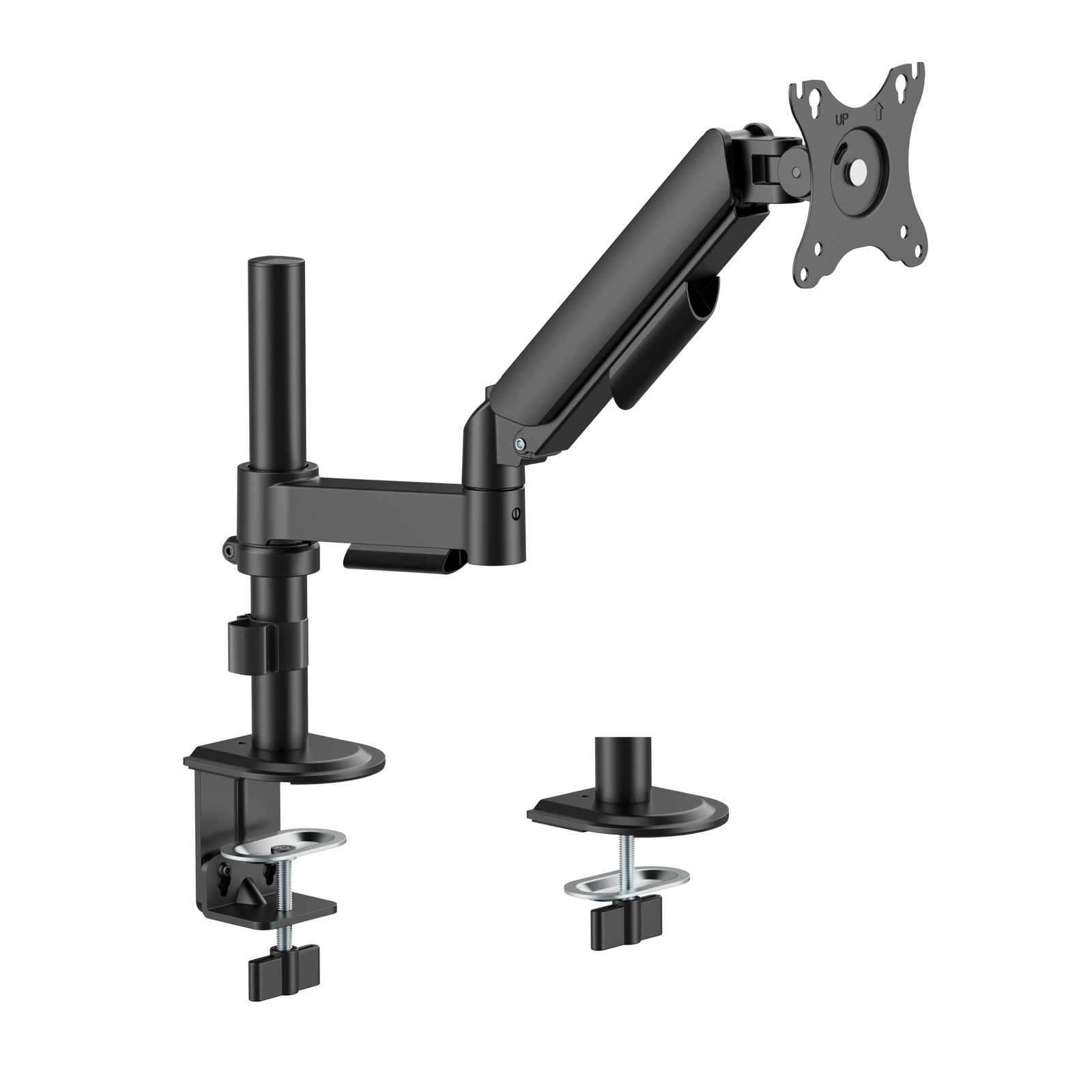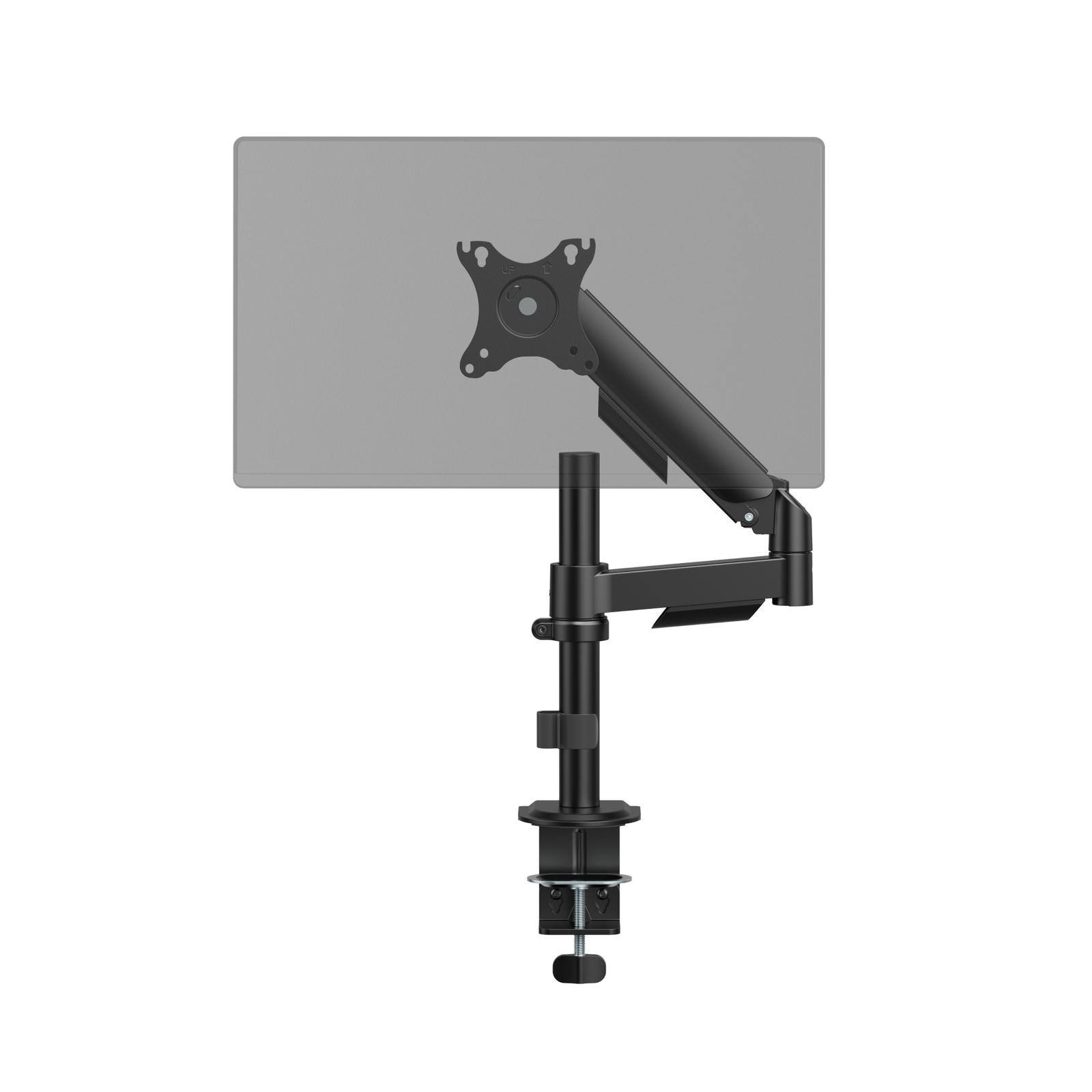 Кронштейн для монитора к столу со струбциной и креплением на трубе, системы газлифт (пружинный механизм), диагональ 17-35", крепление с функцией перемещения в вертикальной плоскости и нагрузкой от 2 до 9 кг.