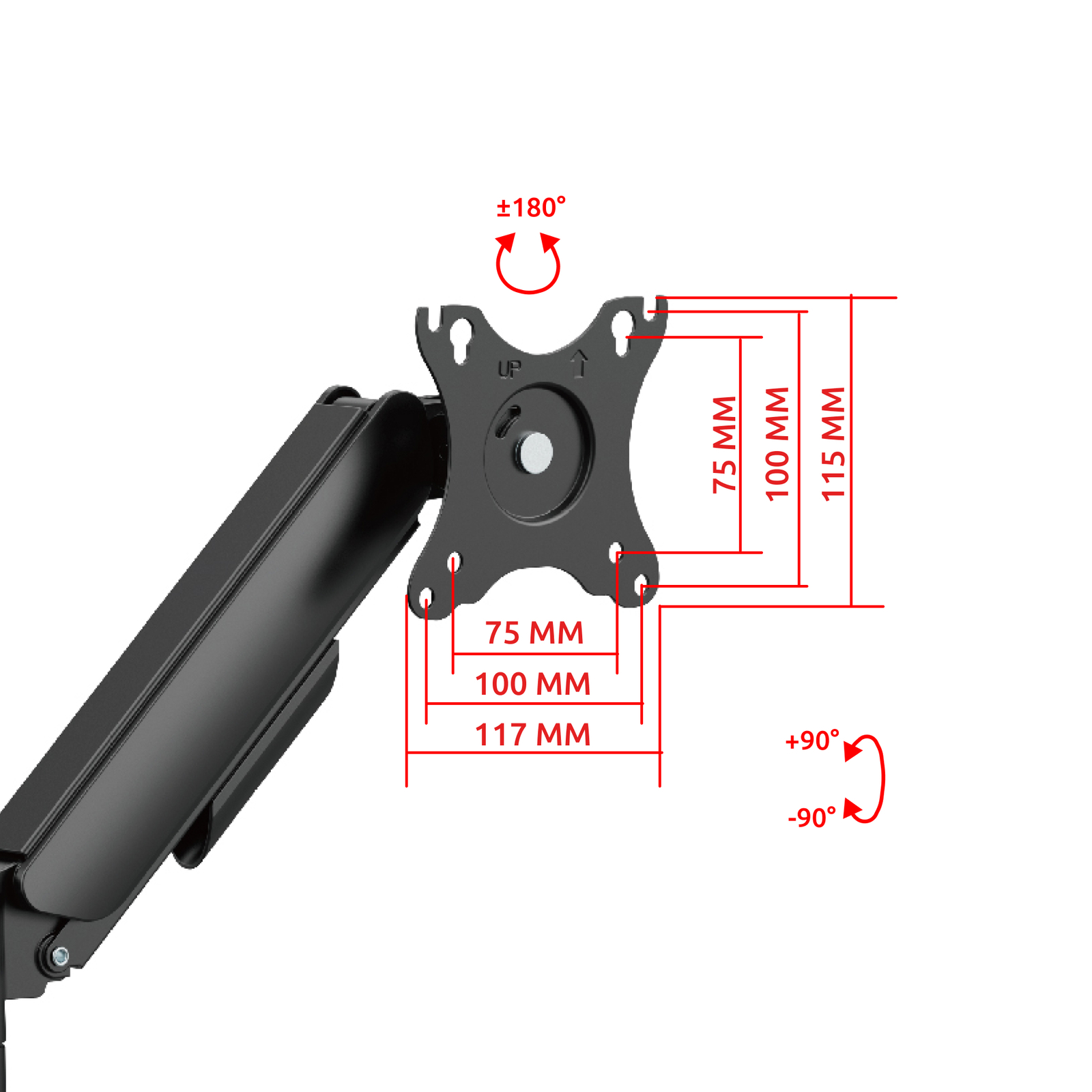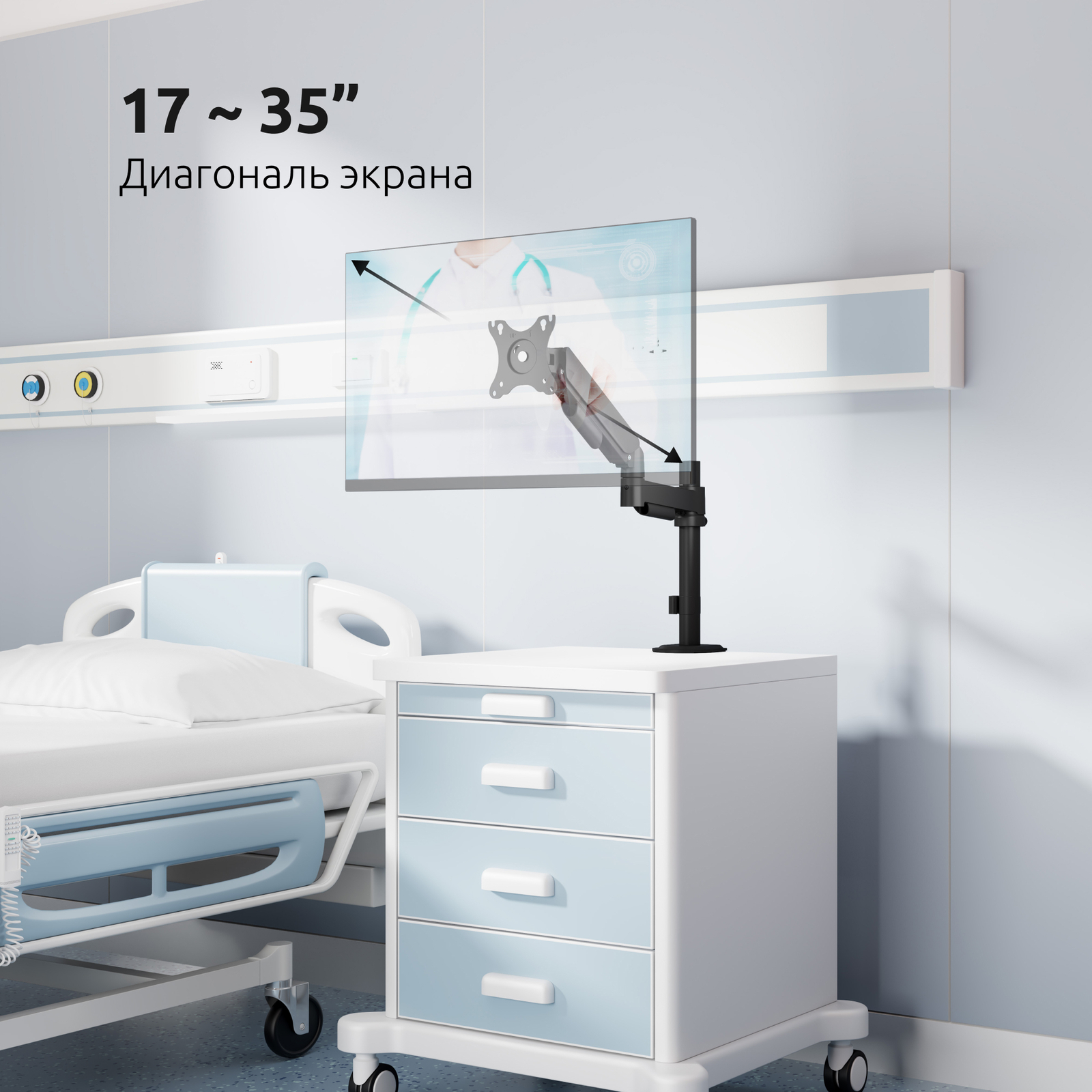 Он подходит для большинства компьютерных мониторов весом от 2 до 9 кг. с диагональю от 17 до 35 дюймов, под самые распространенные крепления стандарта VESA 75х75, 100х100 мм.