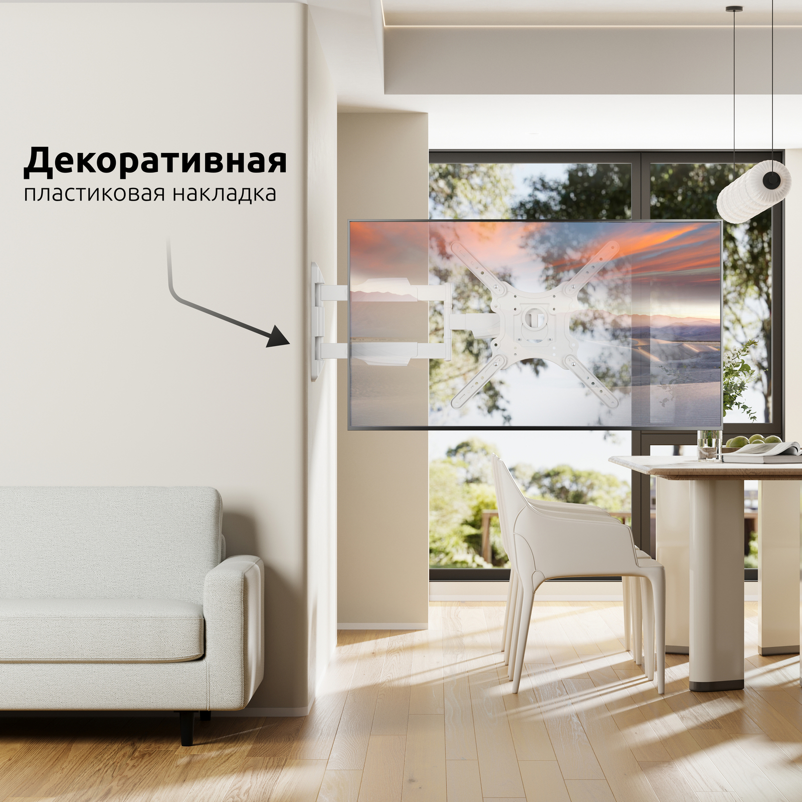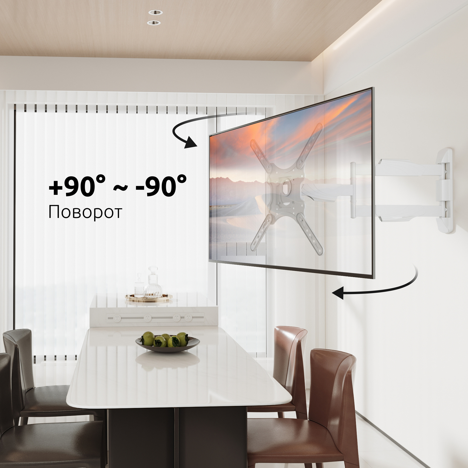 Вы сможете повернуть ТВ и изменить расстояние от стены лёгким движением руки, при этом телевизор зафиксируется в настроенном положении.