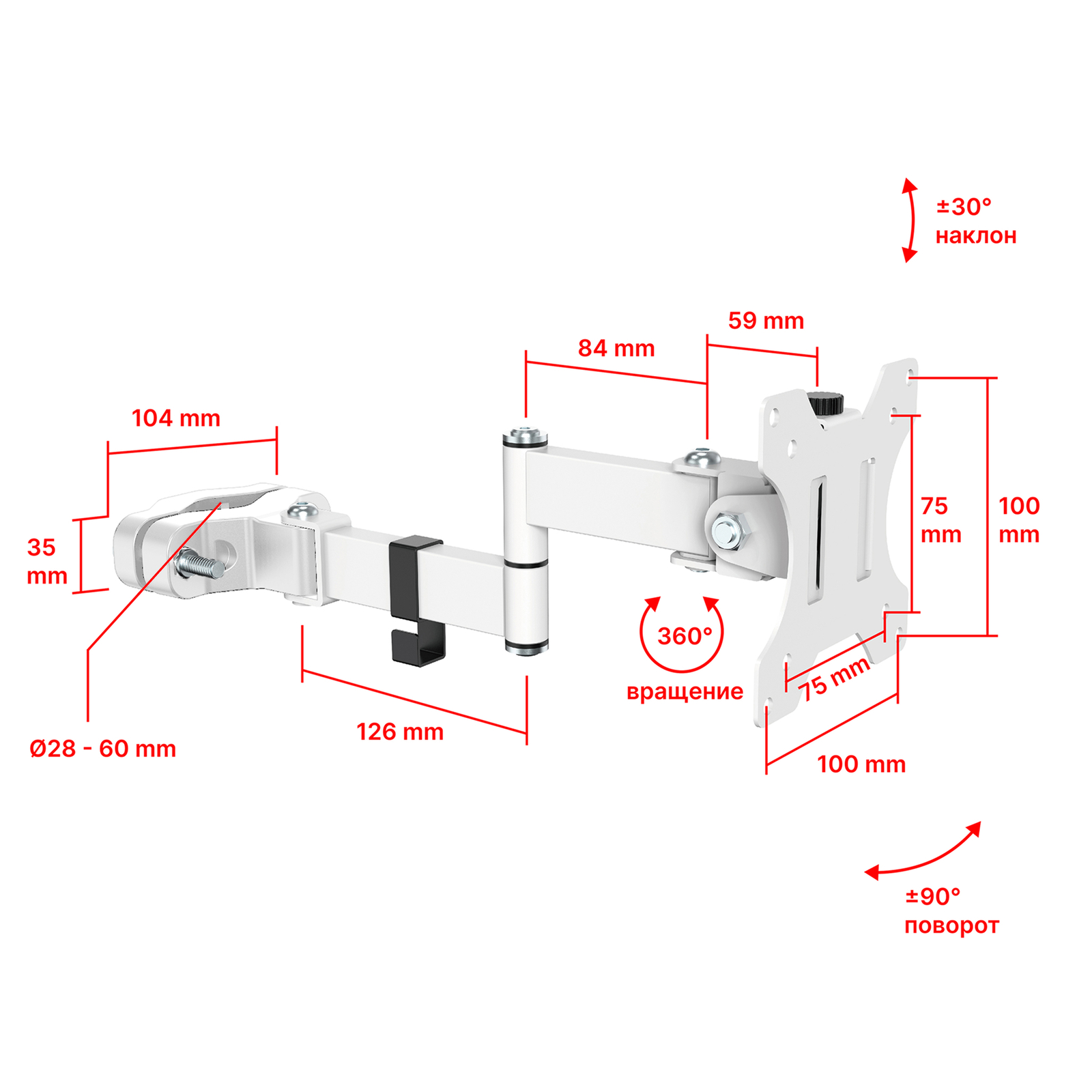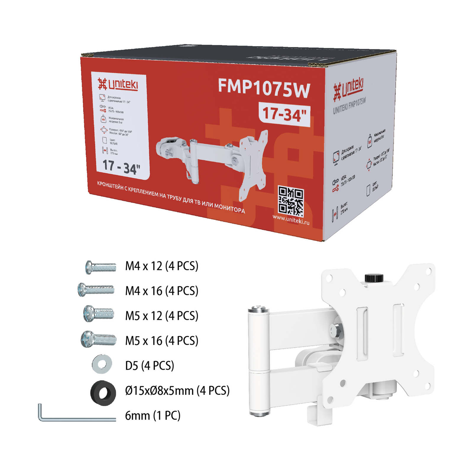 Представляем наклонно-поворотный кронштейн с возможностью крепления к трубе диаметром от 28 до 60 мм. UNITEKI FMP1075W в белом эксклюзивном цвете, который отвечает высочайшим стандартам качества.