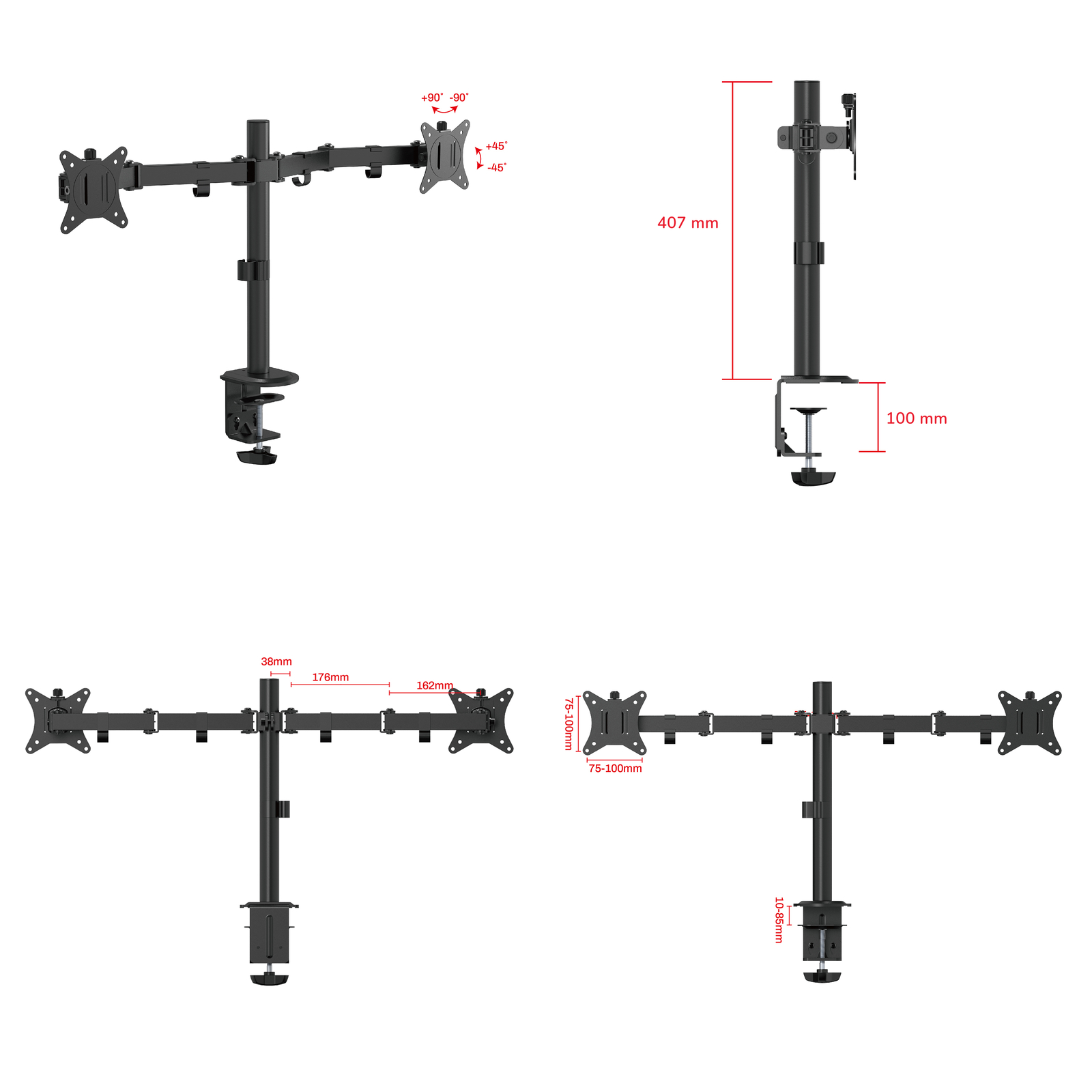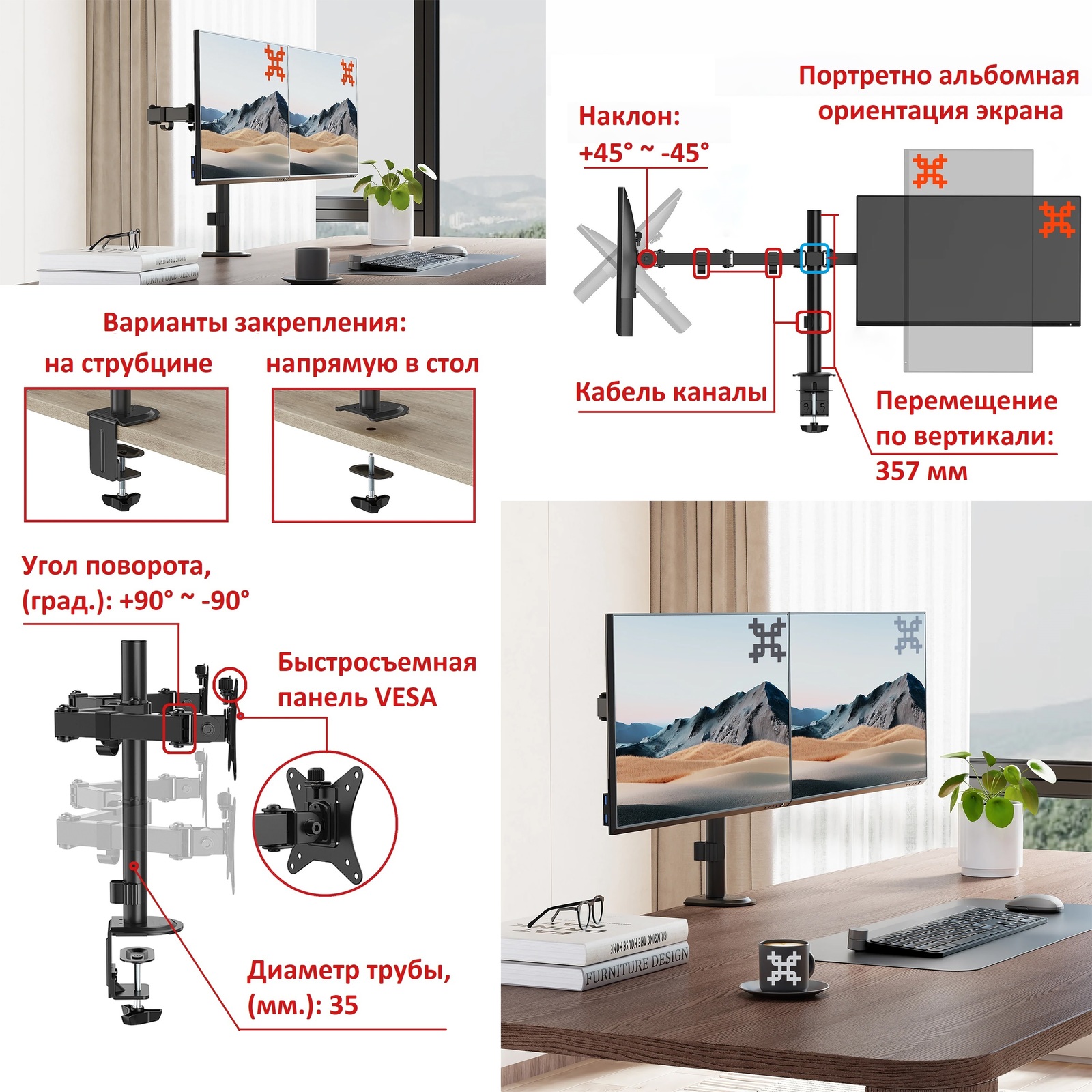 - Тип кронштейна: Настольный со струбциной для двух мониторов с расположением в горизонтальной плоскости
