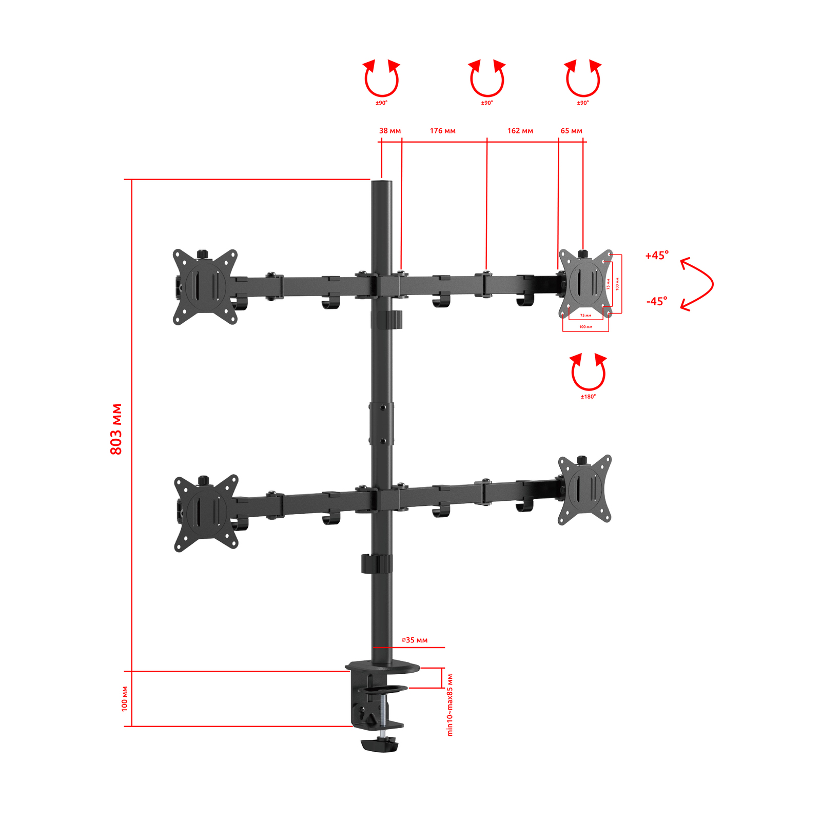 - Тип кронштейна: Настольный со струбциной для четырех мониторов