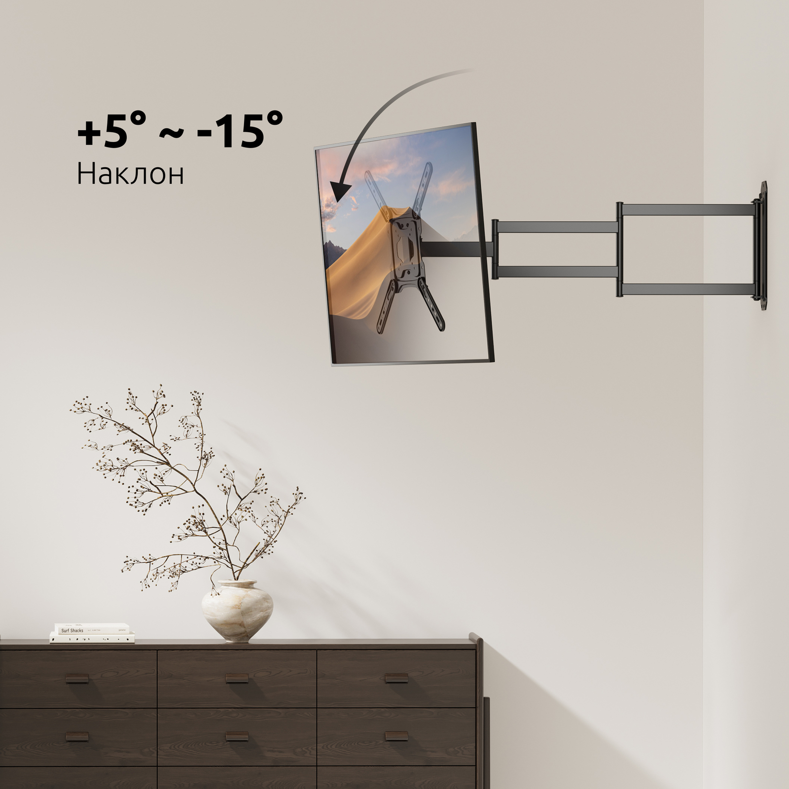 Благодаря значительному вылету от стены, Вы сможете полностью поворачивать экран диагональю до 65 дюймов, располагая его перпендикулярно стене, а также регулировать наклон экрана до 15 градусов вниз.