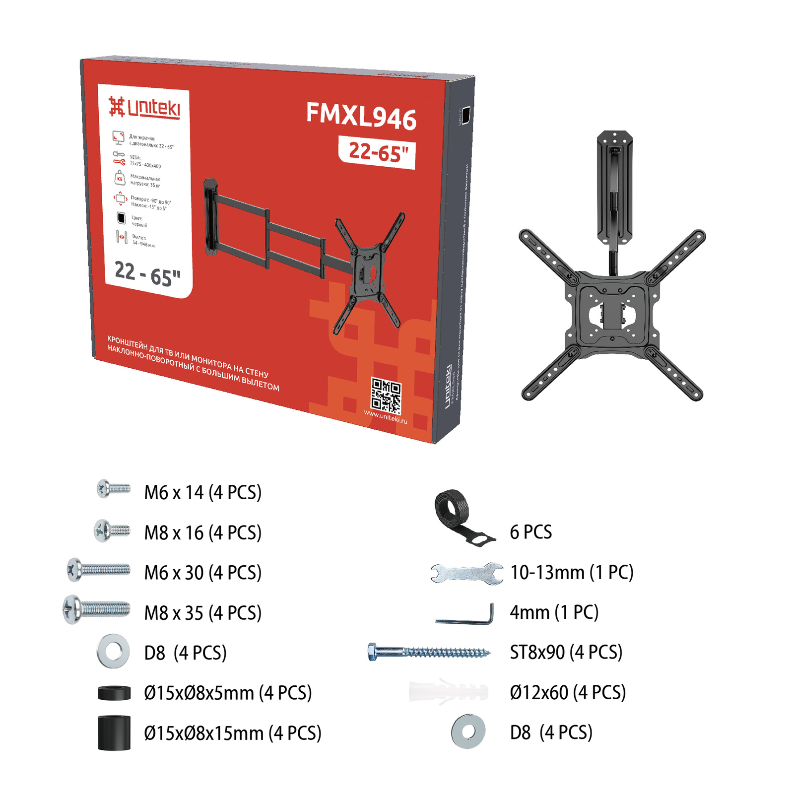 Наша очередная разработка - это настенный, поворотно-наклонный, кронштейн для ТВ и мониторов с большим вылетом от стены, UNITEKI FMXL946, который предназначен для дисплеев с диагональю от 22 до 65 дюймов (55,88~165,1 см.).