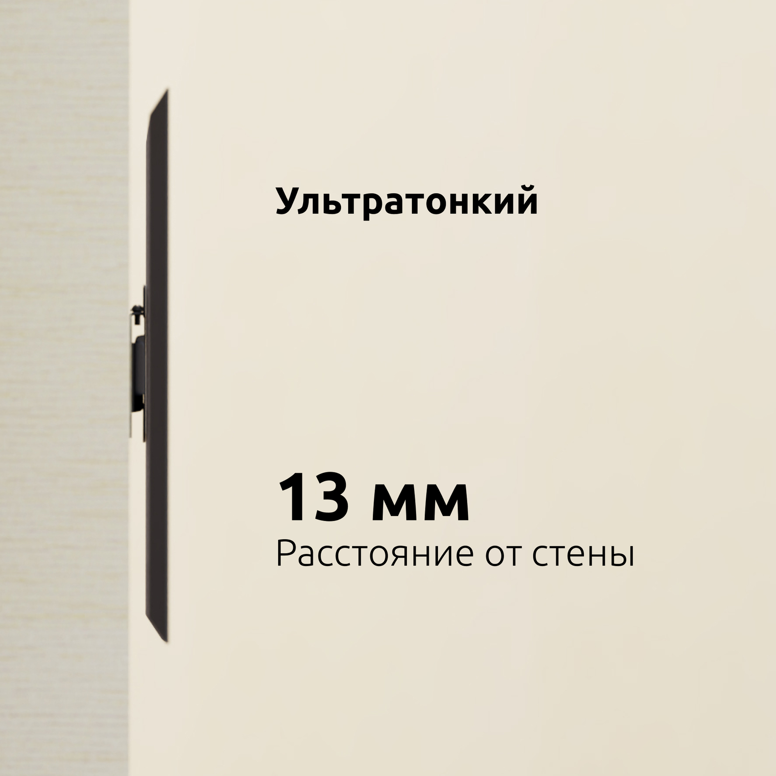 Расстояние от стены составляет 13 мм., что придает кронштейну компактный и аккуратный внешний вид, делая его почти незаметным за Вашей ТВ-панелью.