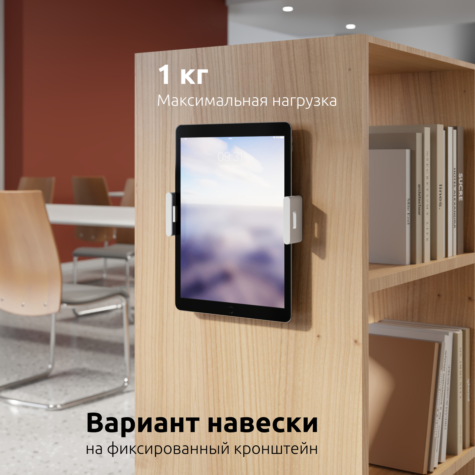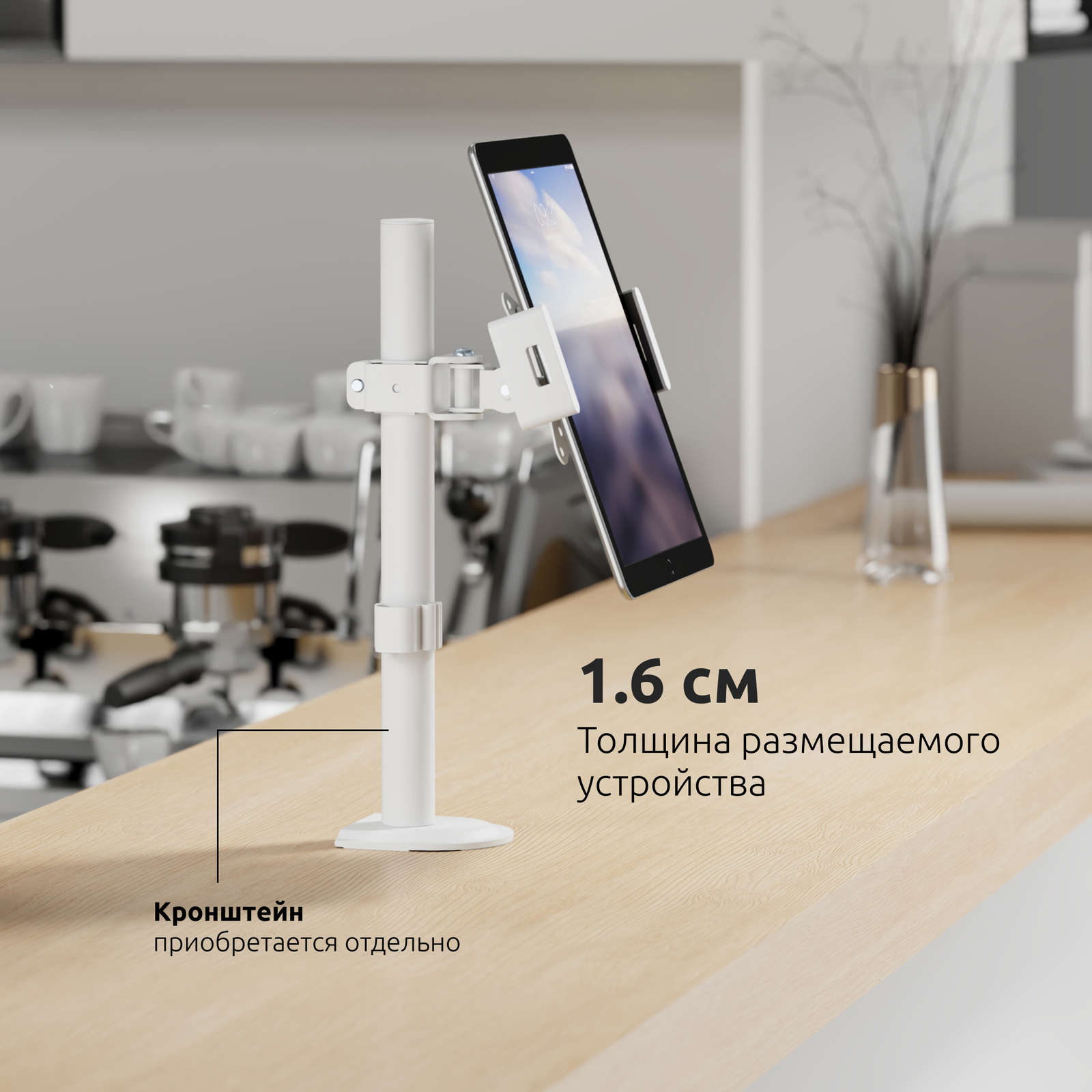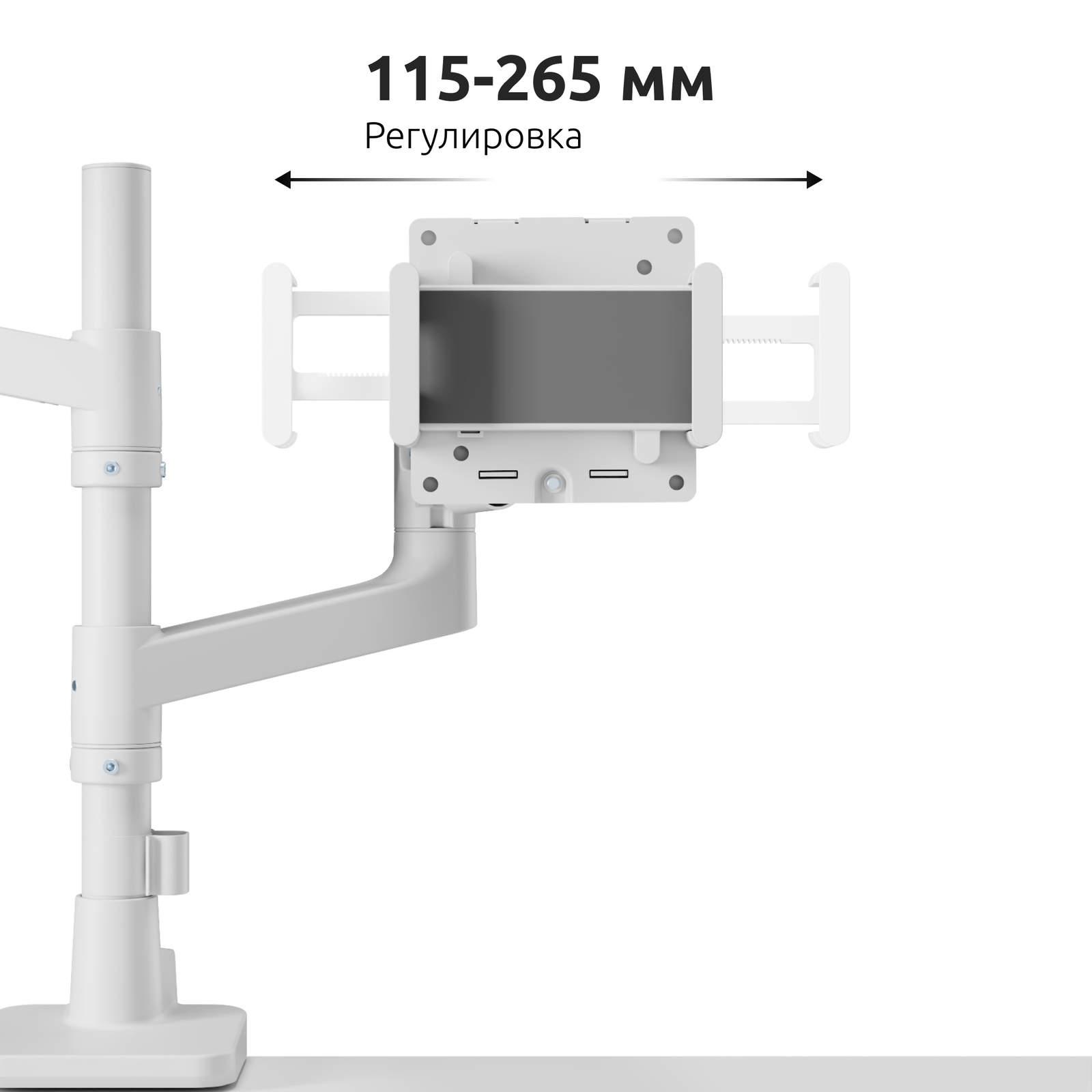 Специальные фиксаторы позволяют настраивать крепление под разные размеры электронных книг, планшетов толщиной до 16 мм., размером от 4,7 до 15,0 дюймов и надежно их закреплять на кронштейне в отверстия VESA.