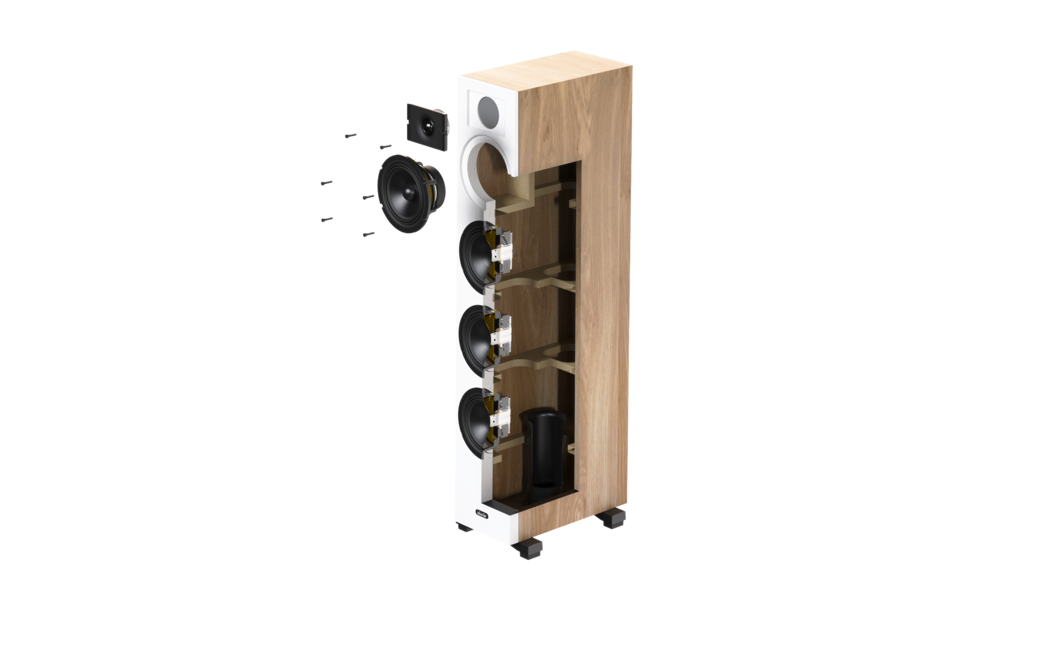 Три электроакустических преобразователя с вогнутыми пылезащитными колпачками отвечают за воспроизведение низких частот. Они оснащены длинными, почти 15-миллиметровыми, многослойными катушками и толстыми алюминиевыми кольцами для линеаризации индуктивности. Это, безусловно, самые мощные излучатели, когда-либо использовавшиеся в напольных акустических системах Indiana Line. Они обеспечивают большие линейные смещения диффузоров. Общий объем воздуха, смещаемый ими, сопоставим, если не превышает, объем модели Diva 660 предыдущего поколения, которая была оснащена парой более крупных 6.5-дюймовых вуферов. Кроме того, благодаря размеру каждого диффузора низкочастотного динамика, используемого в акустической системе Diva 6, они двигаются исключительно быстро и точно, сохраняя при этом низкий уровень искажений даже при высокой громкости.
