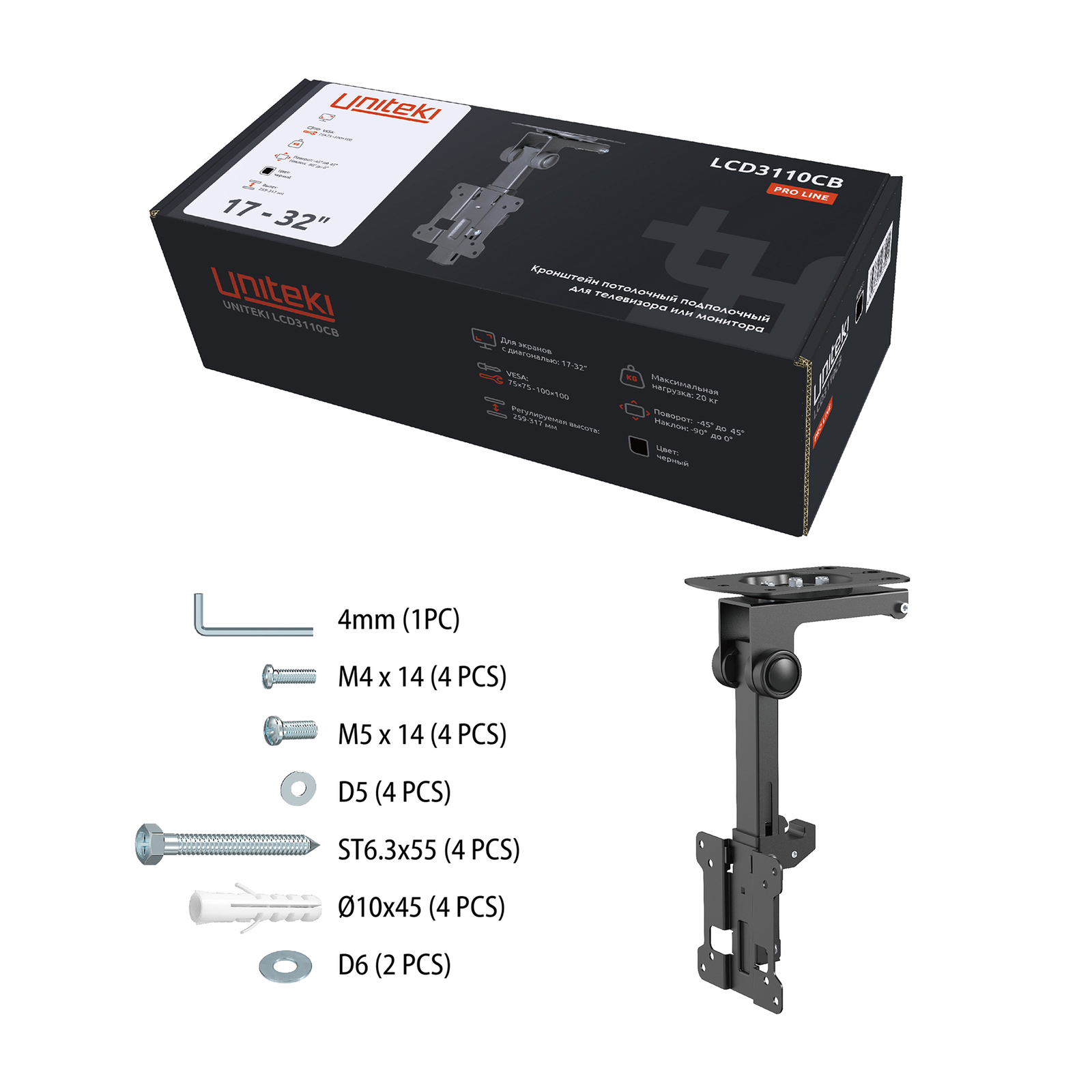 Кронштейн поставляется в оригинальной упаковке, с подробной инструкцией и набором креплений для потолочной, подполочной и настенной инсталляции.