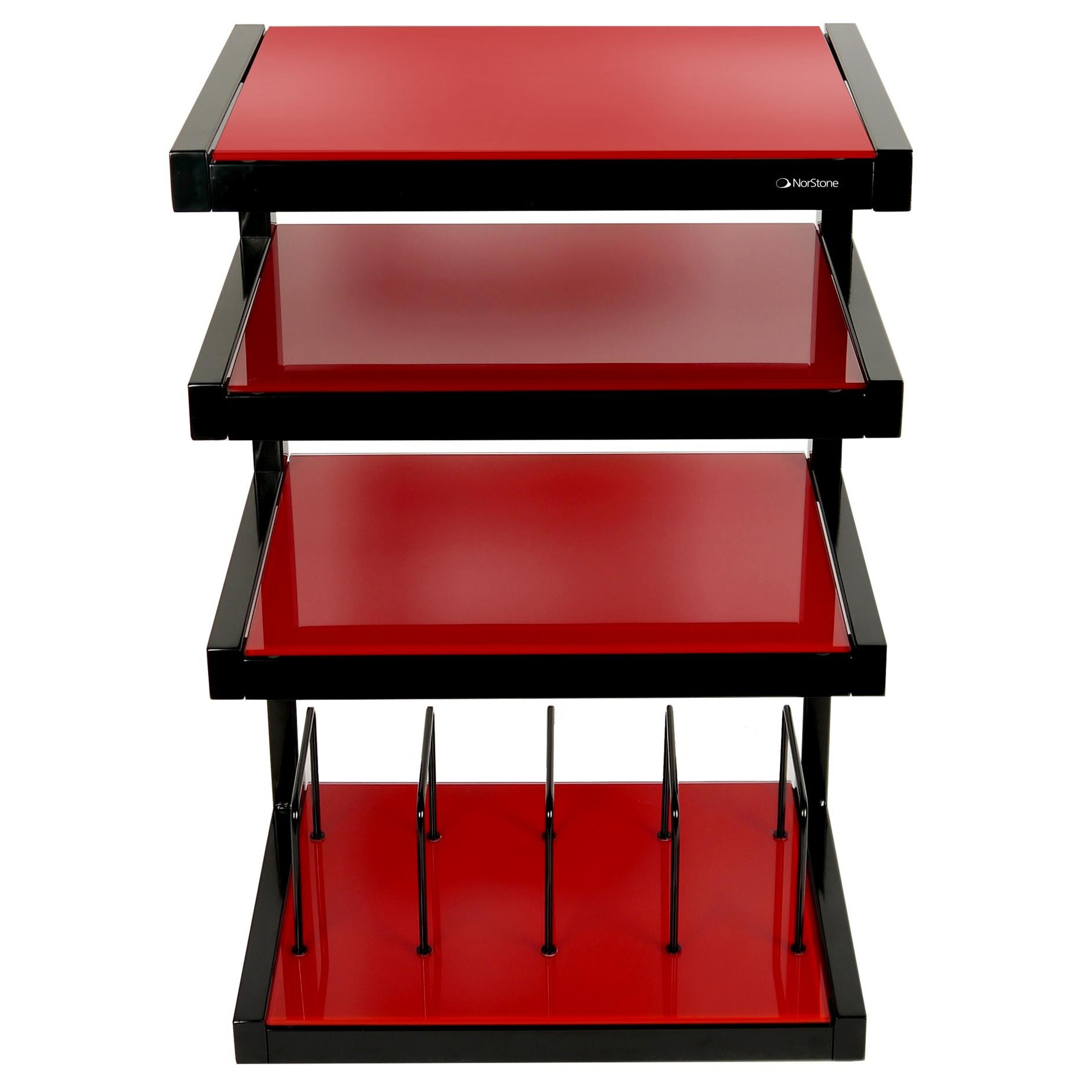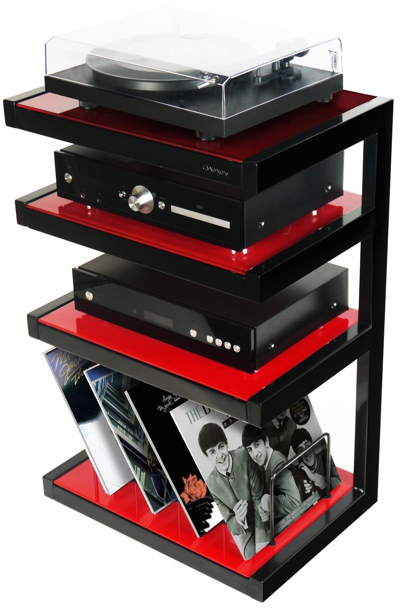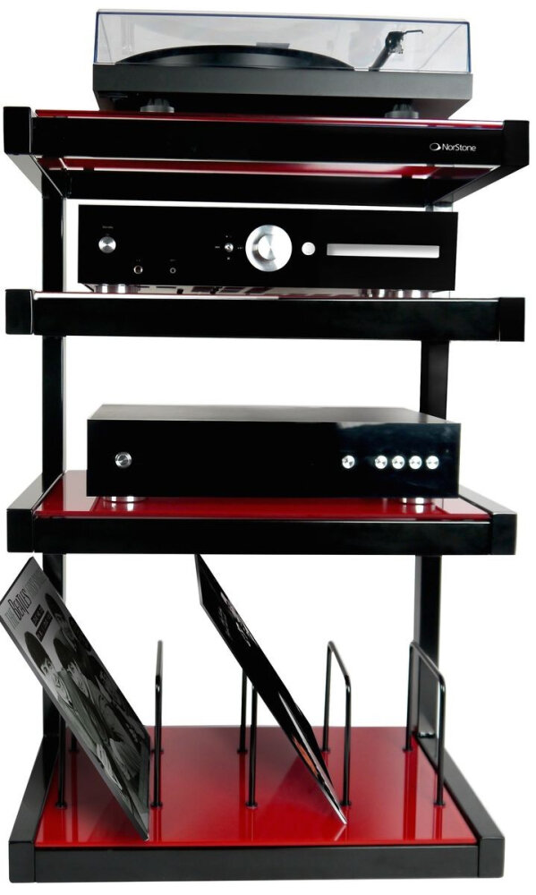 Norstone Esse HiFi Vinyl Black/Red - открытая конструкция стоек обеспечивает легкий доступ к коннекторам и свободное прохождение воздушных потоков, которое способствует эффективному охлаждению аппаратов. Благодаря своей форме стойки могут быть установлены вдоль стены, в углах комнаты, на свободном пространстве. Они абсолютно устойчивы и позволяют размещать на них даже чувствительные к вибрации виниловые проигрыватели. Как правило, мебель NorStone Design имеет модульную конструкцию и предполагает несколько вариантов сборки. Портящие общее впечатление кабели могут быть убраны в полое пространство ножек или аккуратно закреплены в тыловой части стоек. Ножки имеют специальное покрытие, предохраняющее пол (в том числе деликатный паркет) от царапин.