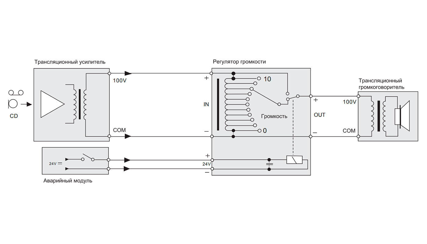 - Реле 24В для принудительного включения на максимальную громкость в случае чрезвычайной ситуации;