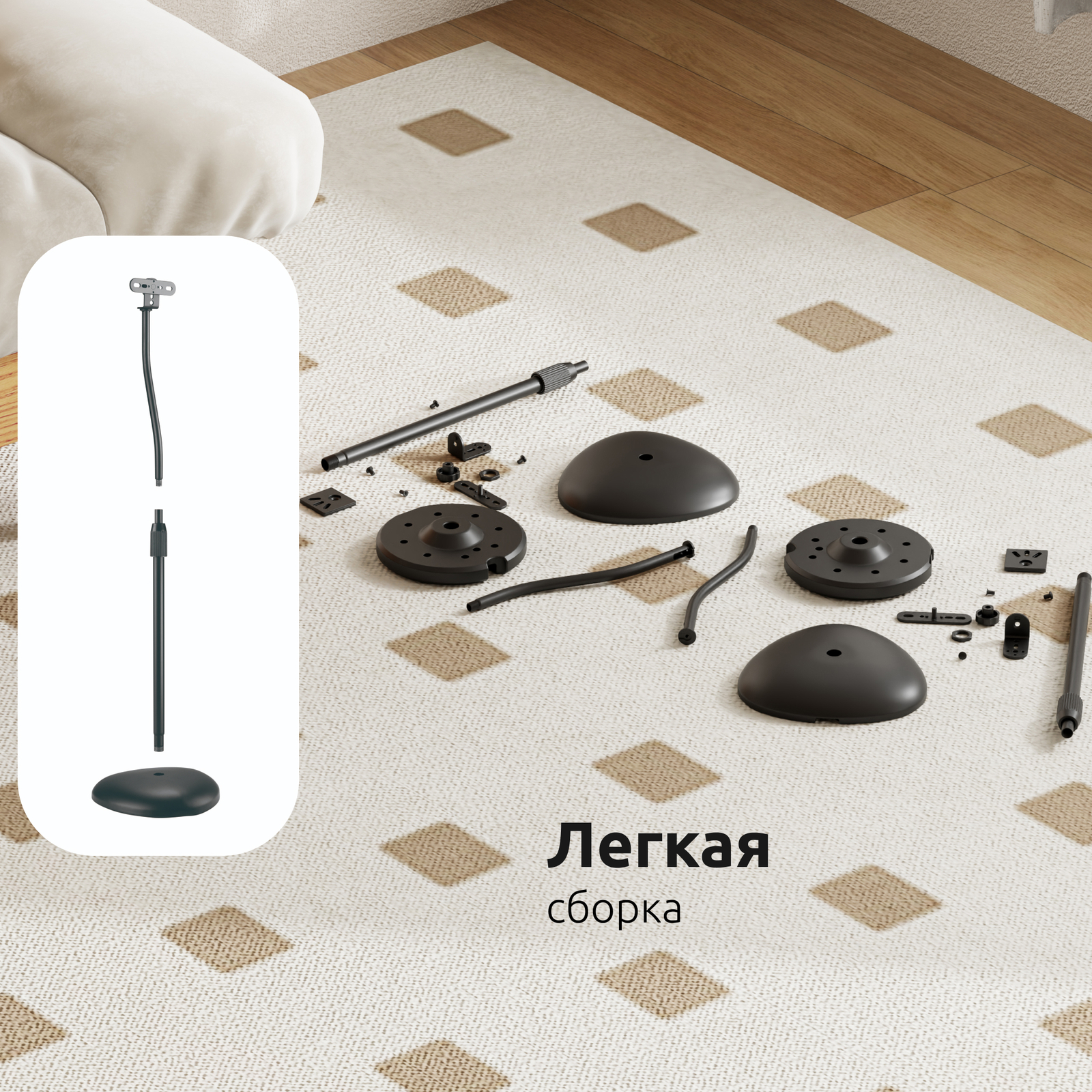 Компактность и мобильность стойки позволят удобно организовать пространство, а при необходимости, разобрать конструкцию полностью и убрать в место хранения..