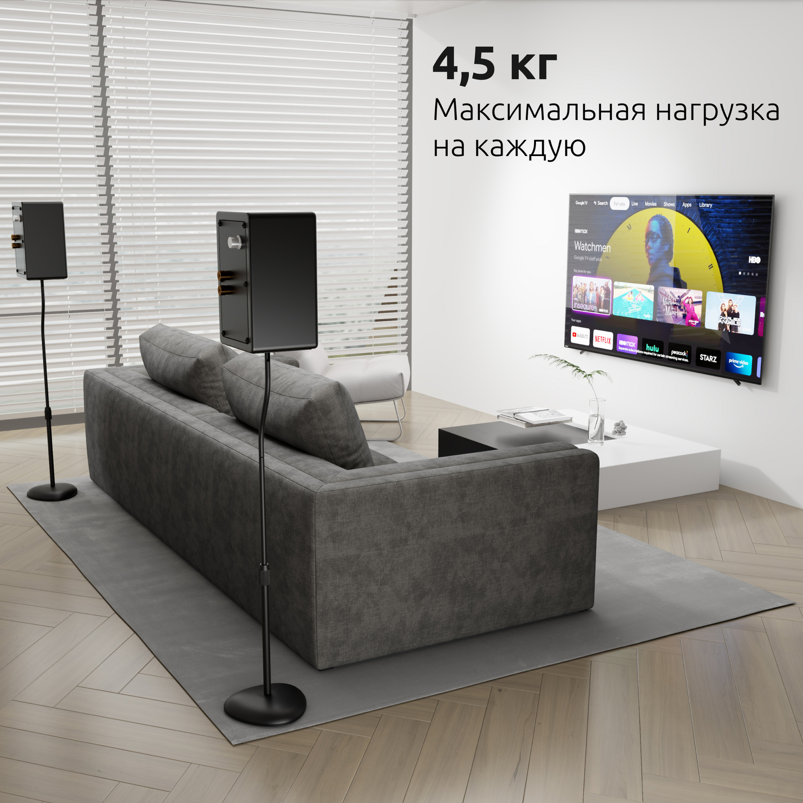 Прочная и устойчивая основа со стальными шипами для коврового покрытия и резиновыми прокладками для деревянных и плиточных полов, акустически изолирует стойки от пола и обеспечит стабильность при воспроизведении звука.