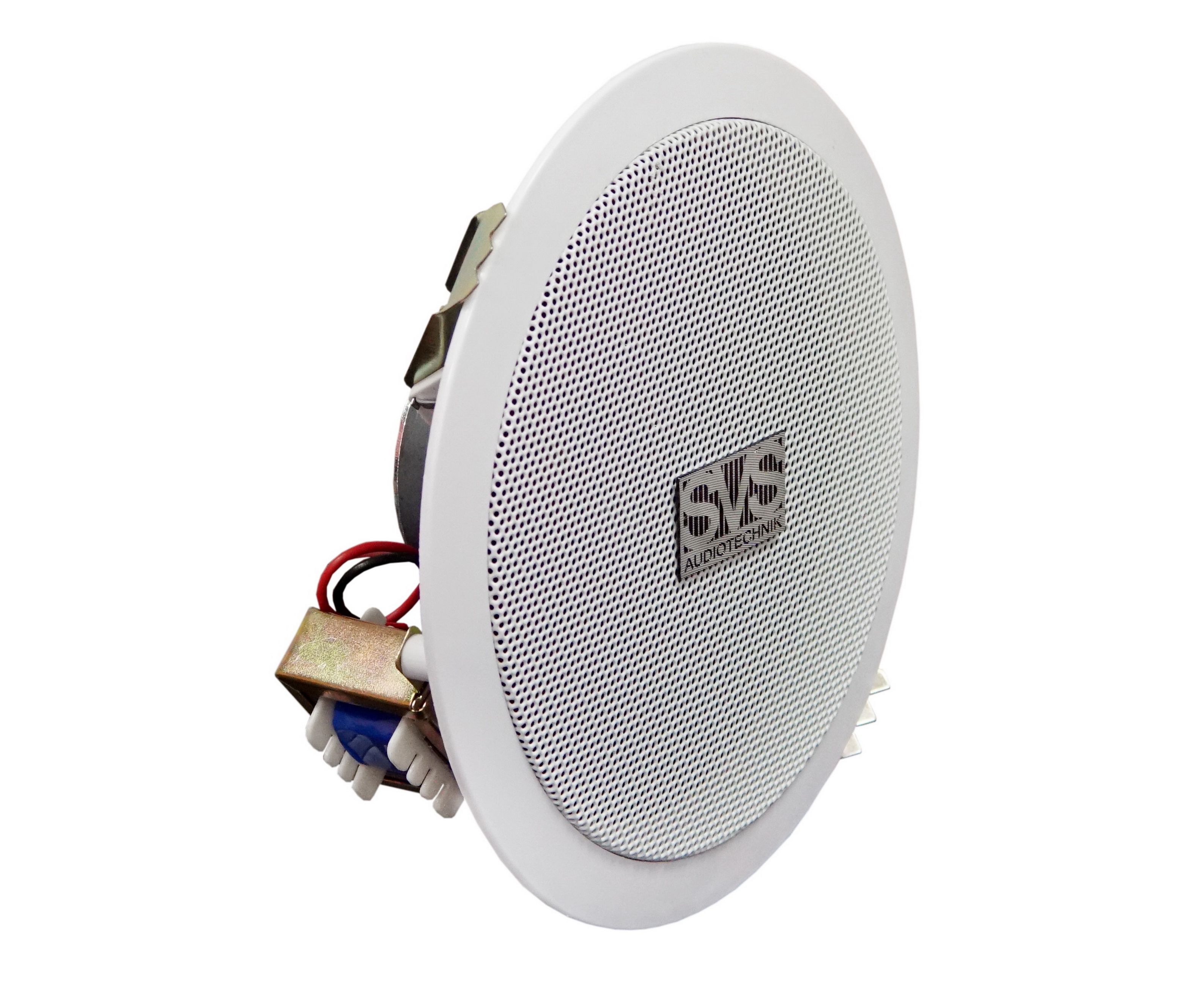 Широкополосный громкоговоритель SVS Audiotechnik SC-105 предназначен для работы в составе трансляционных 100V линий и имеет установленный с обратной стороны корпуса качественный согласующий трансформатор с отводами двух различных мощностей - 3 и 6W.