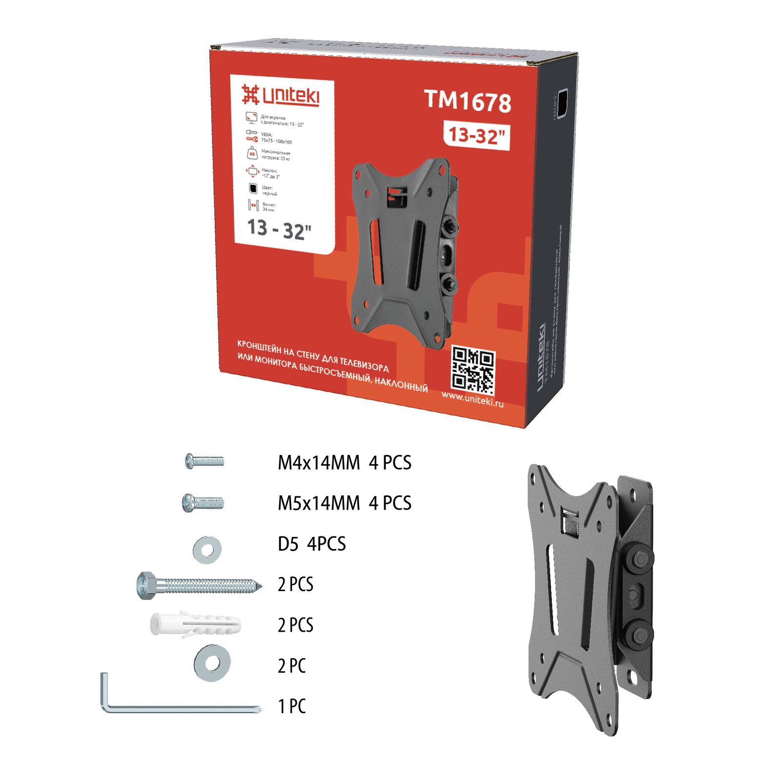 Настенный наклонный кронштейн серии SLIM UNITEKI TM1678 предназначен для телевизоров и мониторов с диагональю от 13 до 32 дюймов.