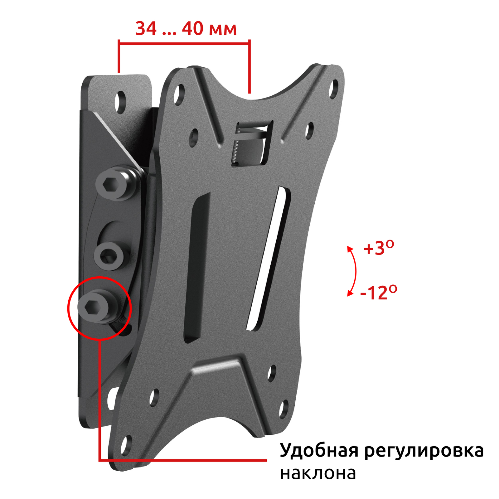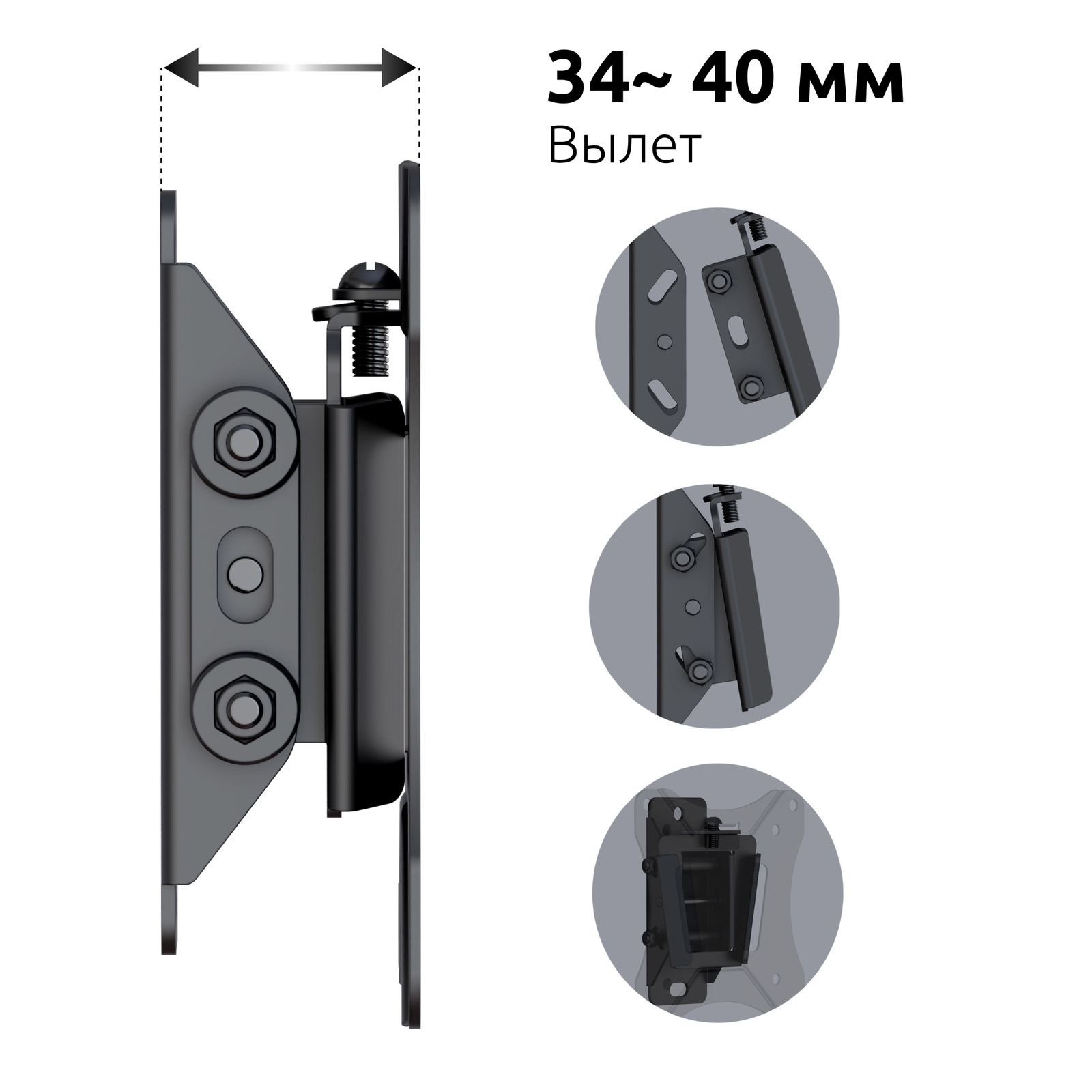 Расстояние от стены составляет 34-40 мм., что придает кронштейну компактный и аккуратный внешний вид, делая его почти незаметным за Вашей ТВ-панелью.