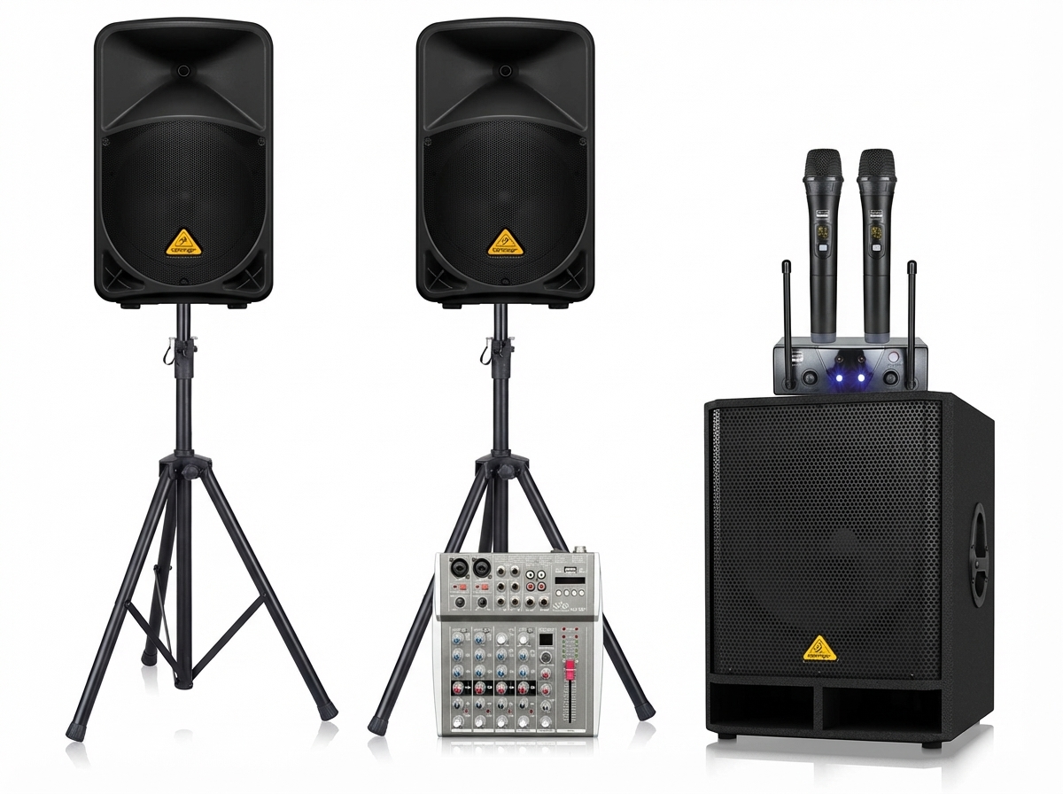 Звуковая основа системы 2 активные колонок по 500 Вт., мощный сабвуфер на 500 Вт. Напольные стойки позволят удобно расположить колонки в зале. Система имеет микшерный пульт со встроенным MP3 плеером, что обеспечит музыкальное сопровождение без использования дополнительных устройств. Комплект радиомикрофонов с двумя ручными микрофонами позволит выступать двум участникам одновременно. Комплект имеет законченный вариант и самодостаточен.